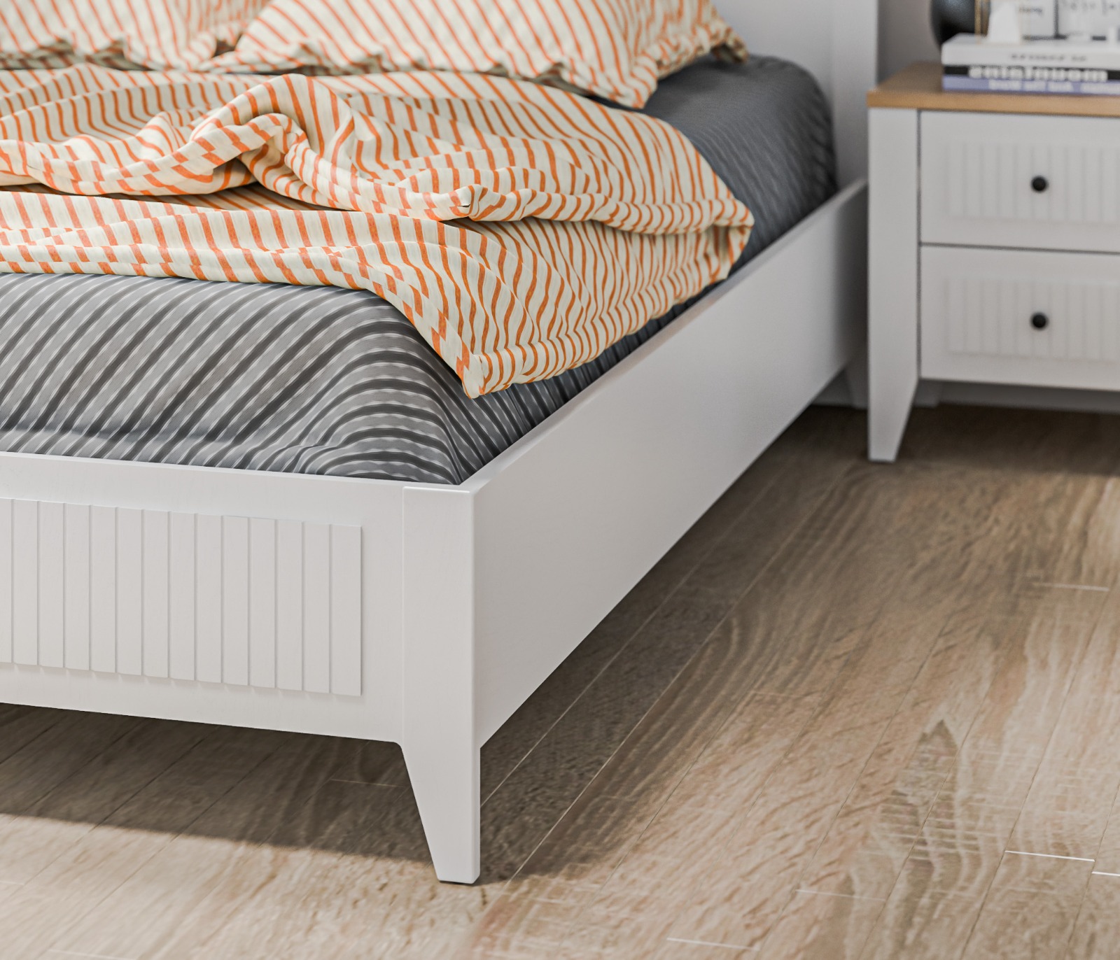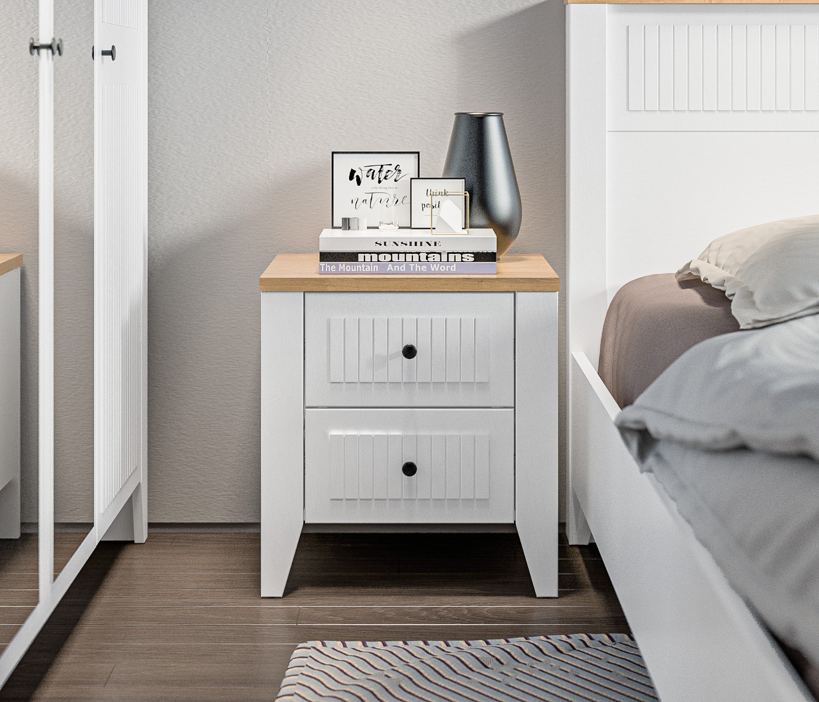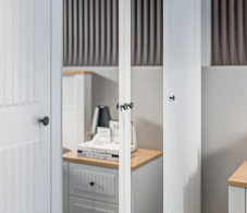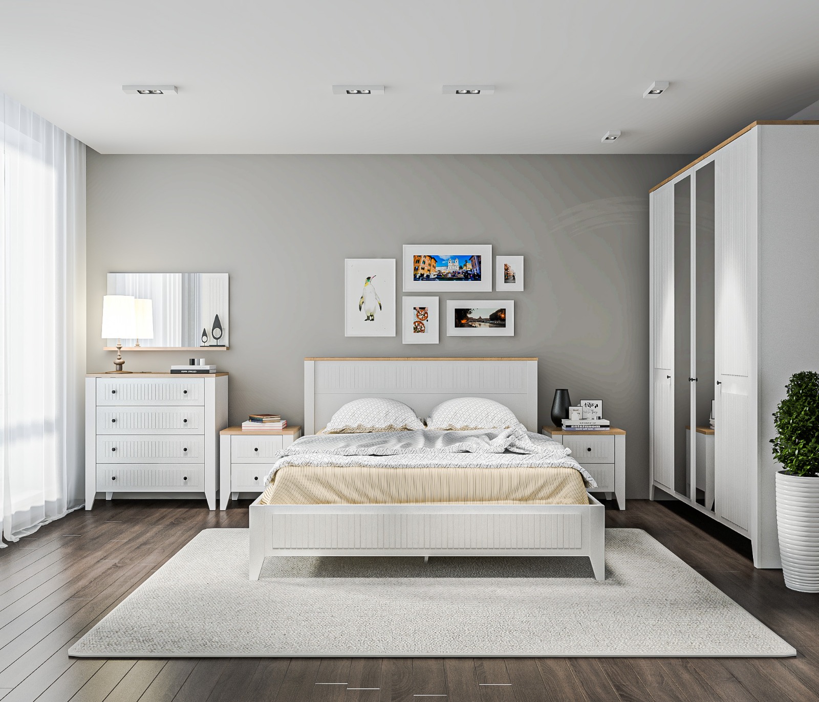 • Спальня выполнена в нежном и светлом оттенке Белый Альпийский, который визуально расширяет пространство и придаёт комнате лёгкость.