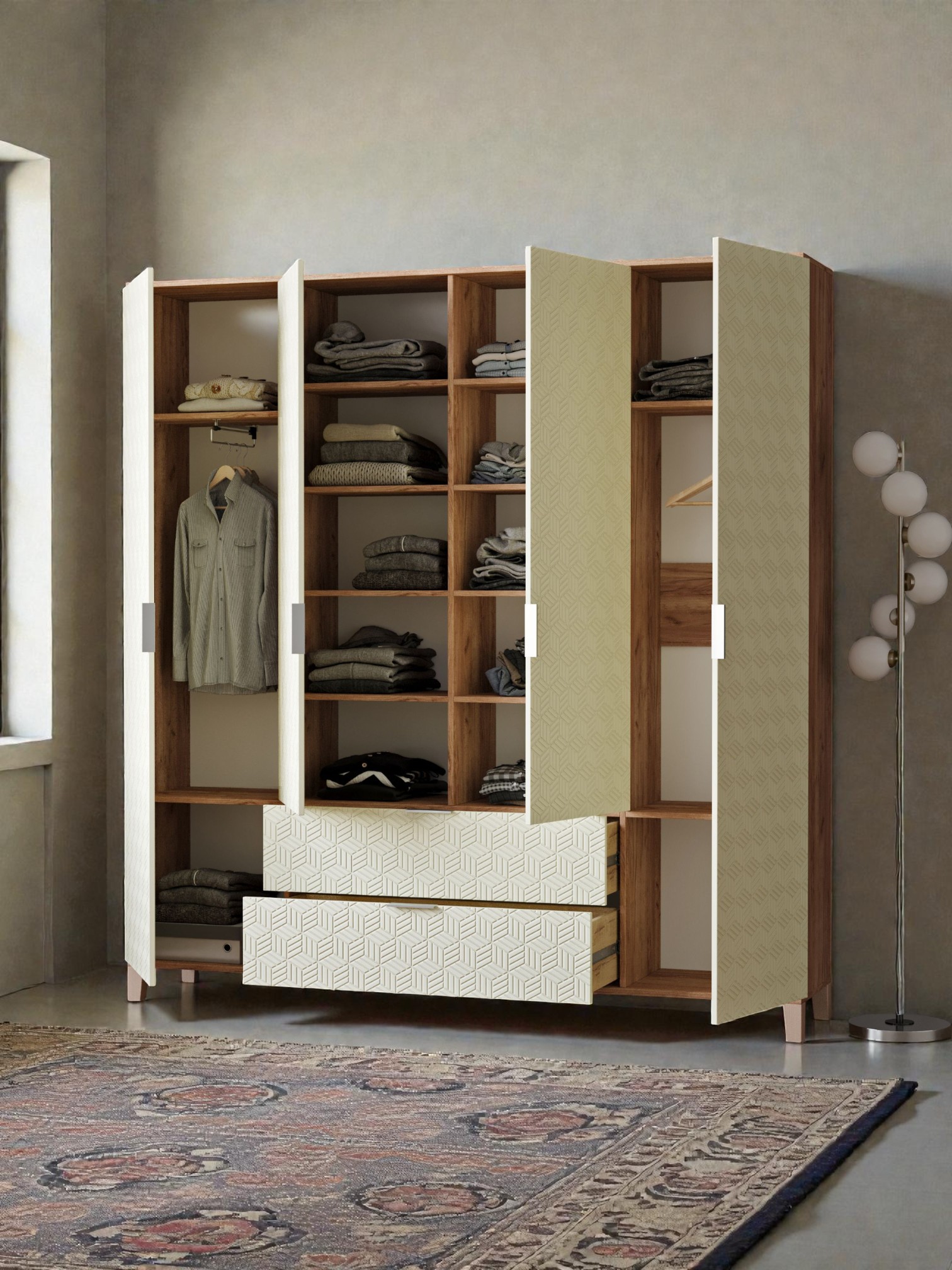 Шкафы Марвин, выполненные в скандинавском стиле, органично дополнят интерьер любой комнаты. Ножки из массива бука, геометрическая фрезеровка на фасадах, сочетание цветов отличительная черта серии Шкафов Марвин.