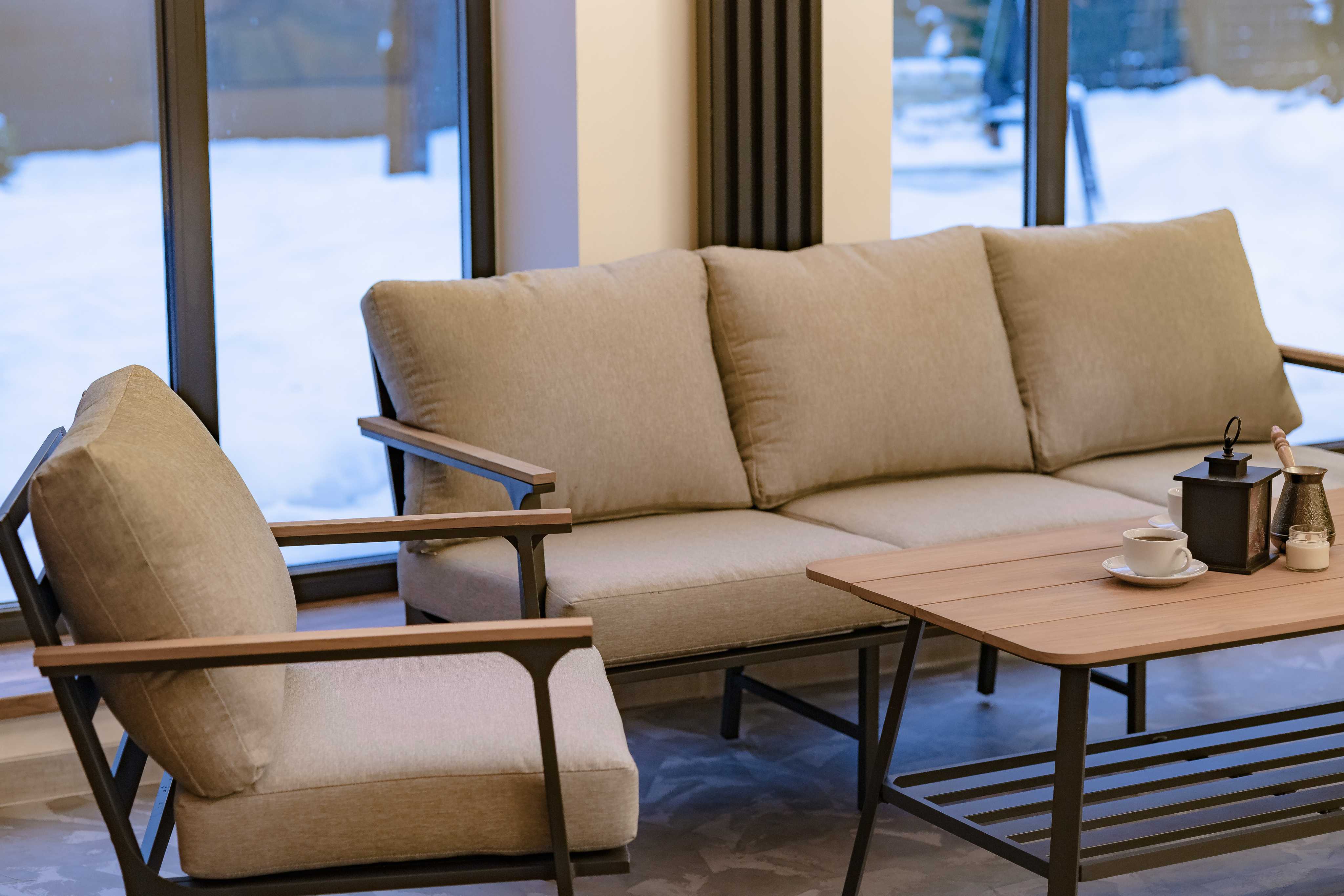 Диван и кресла дополнены мягкими подушками светло-серого цвета, которые обеспечивают удобство и комфорт во время отдыха. Подушки выполнены из высококачественного материала OLEFIN, который не только приятен на ощупь, но и легко чистится.