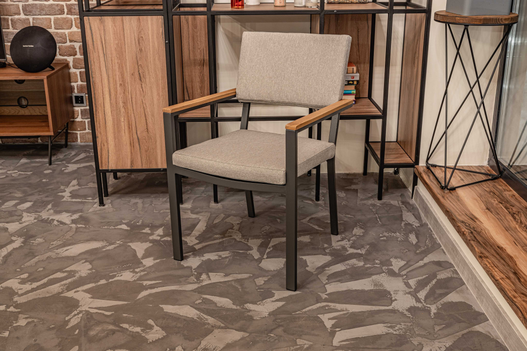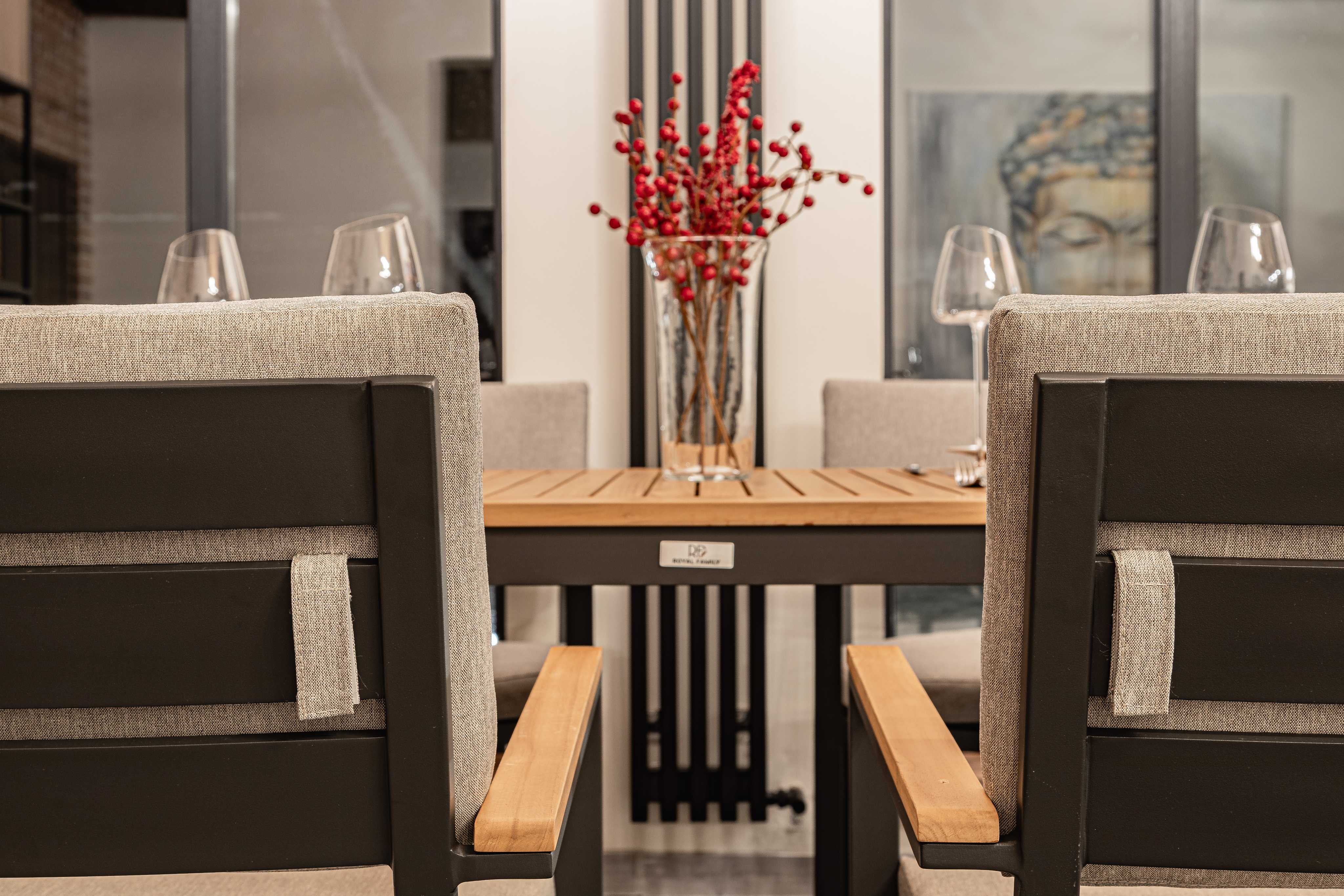 Основой кресла является алюминиевый каркас, который обеспечивает надежность и прочность конструкции. Подлокотники из натурального тика не только добавляют креслу изысканный вид, но и обеспечивают комфортную поддержку рук во время еды или отдыха.
