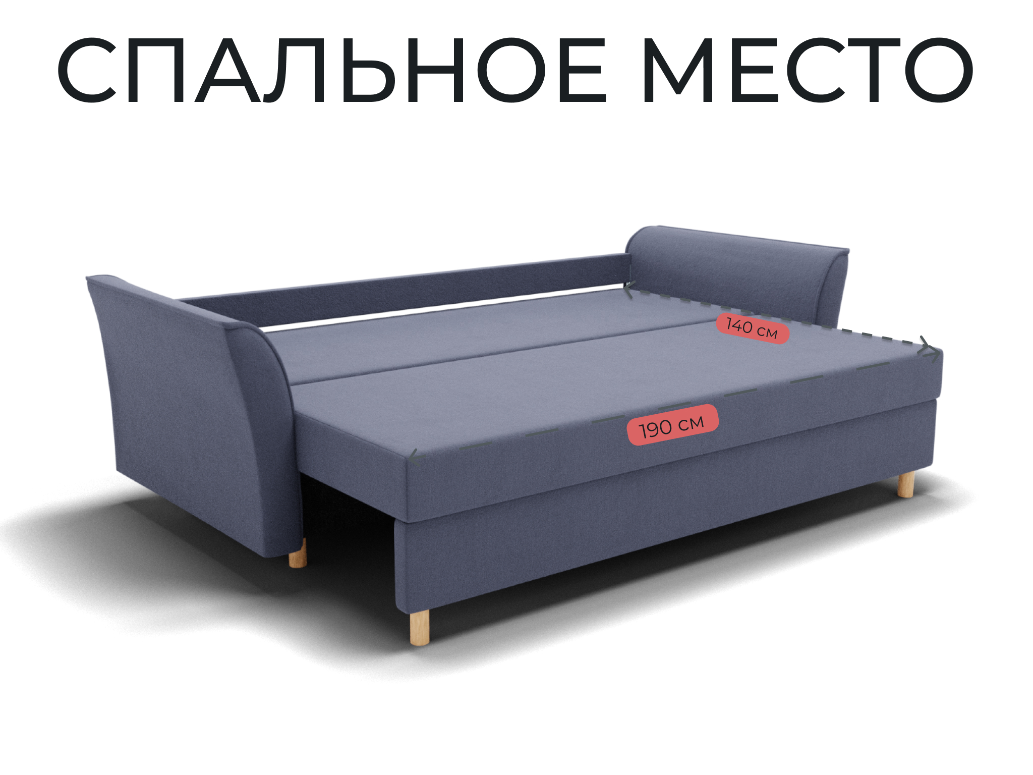 Спальное место: ширина - 140 см, длина - 190 см. Максимальная нагрузка - 250 кг.