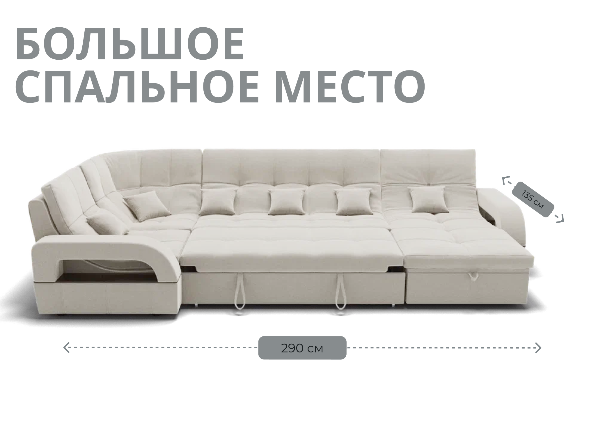 Спальное место имеет ширину 135 см и длину 290 см. Он предназначен для двух человек и имеет глубину сиденья 65 см. Максимальная нагрузка на диван составляет 280 кг.