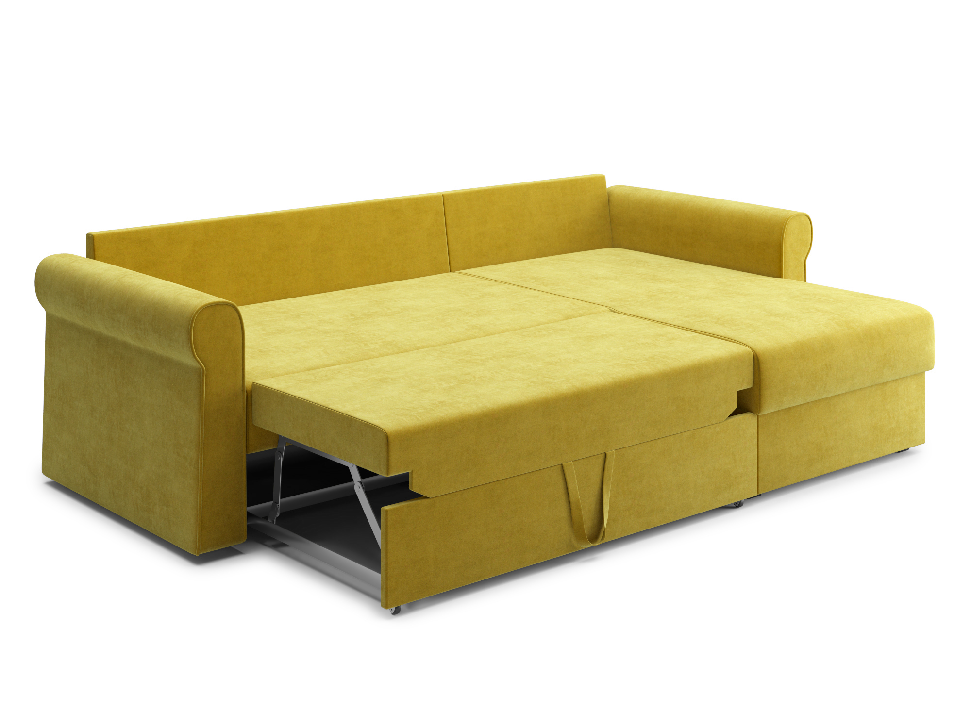 - Механизм раскладки дельфин — основан на выкатывании дополнительной платформы, скрытой под сидением дивана. Чтобы разложить диван, нужно потянуть за специальные ремешки, помогающие перемещать элементы конструкции. В результате этого действия нижняя часть дивана начнёт перемещаться. Делать это нужно до тех пор, пока часть не выдвинется максимально вперед. Затем следует немного приподнять элемент и упереть в противоположную часть, которая осталась неподвижной. Под сиденьем дивана находится короб для хранения вещей и постельных принадлежностей.