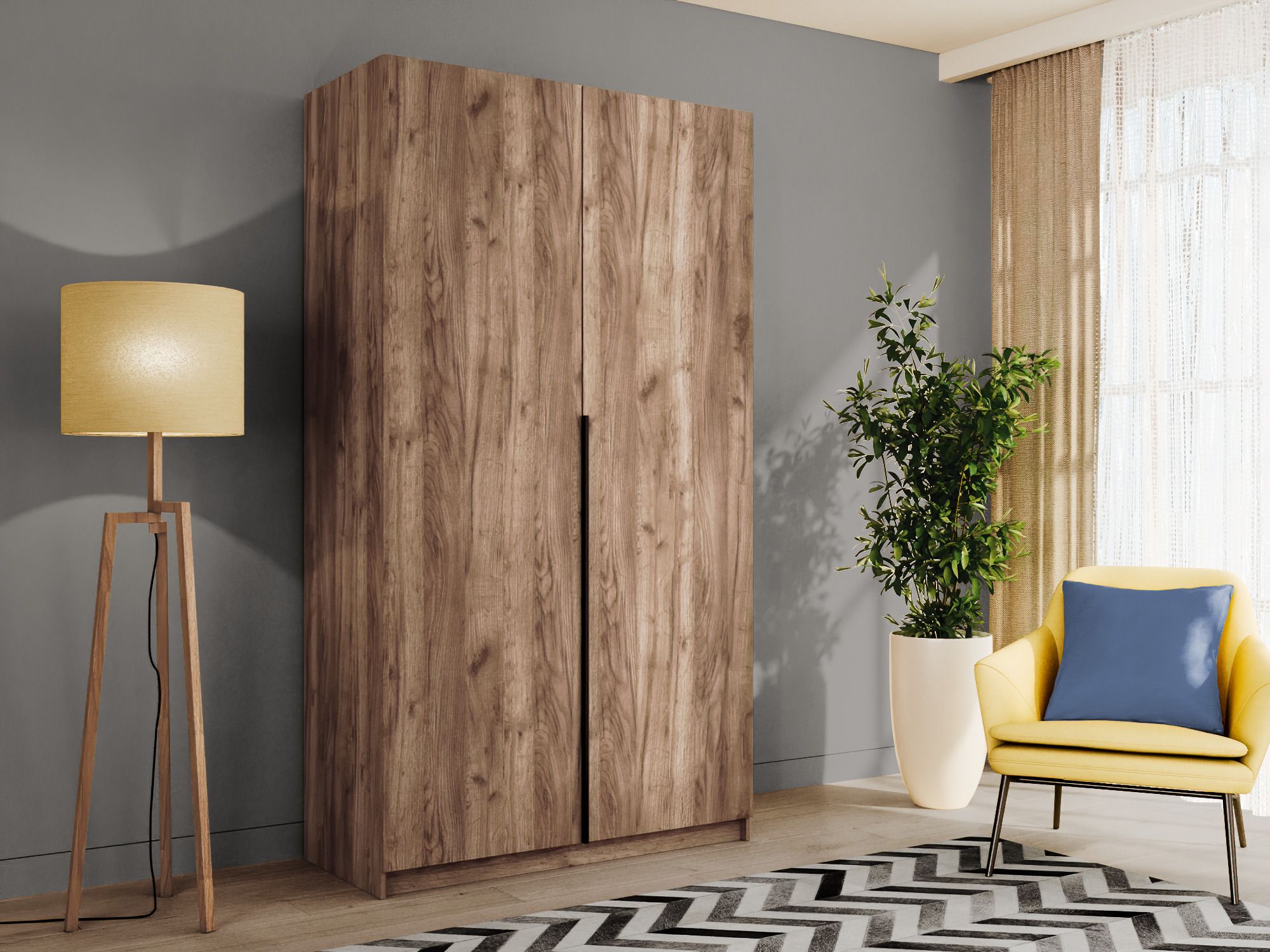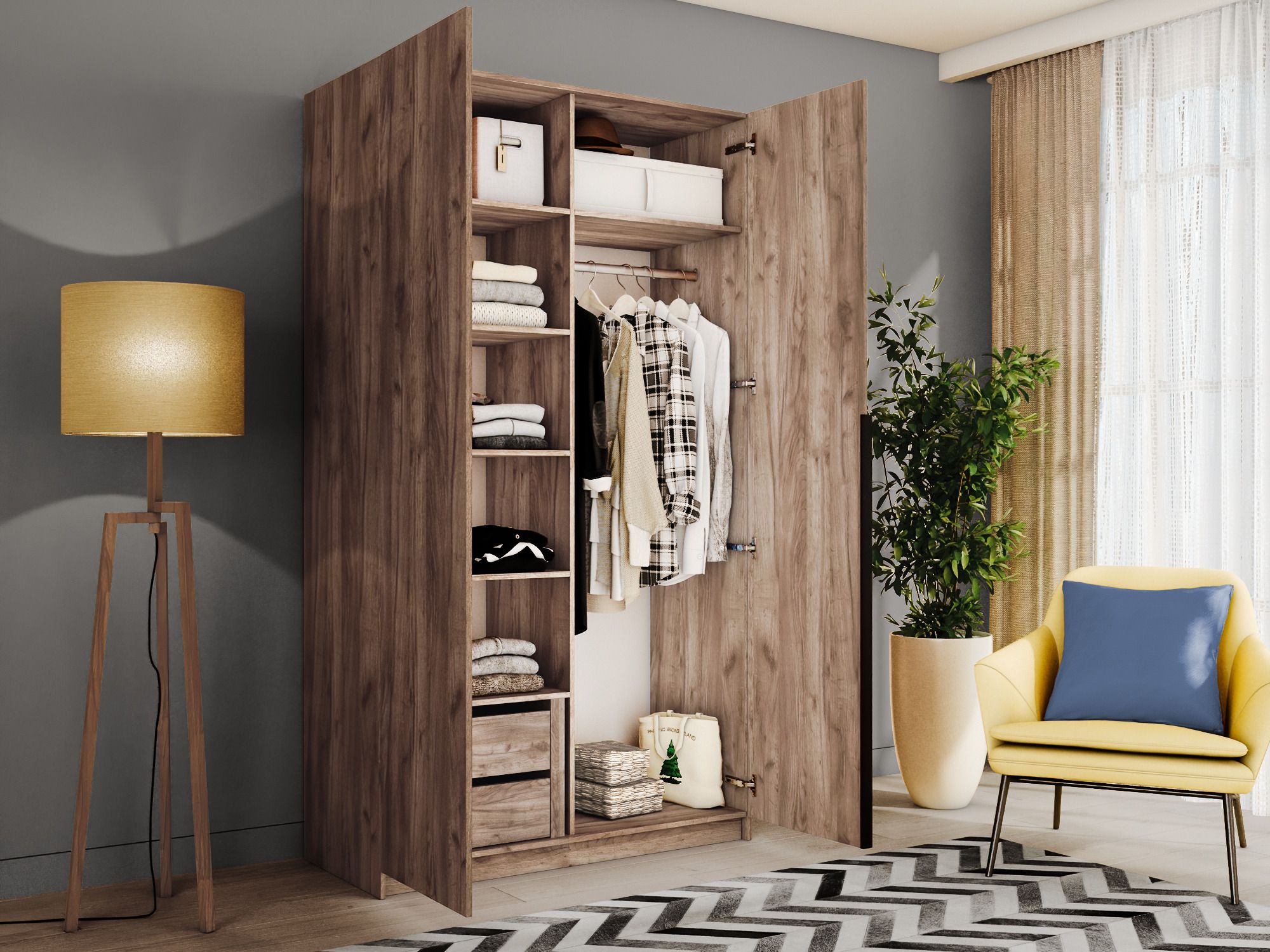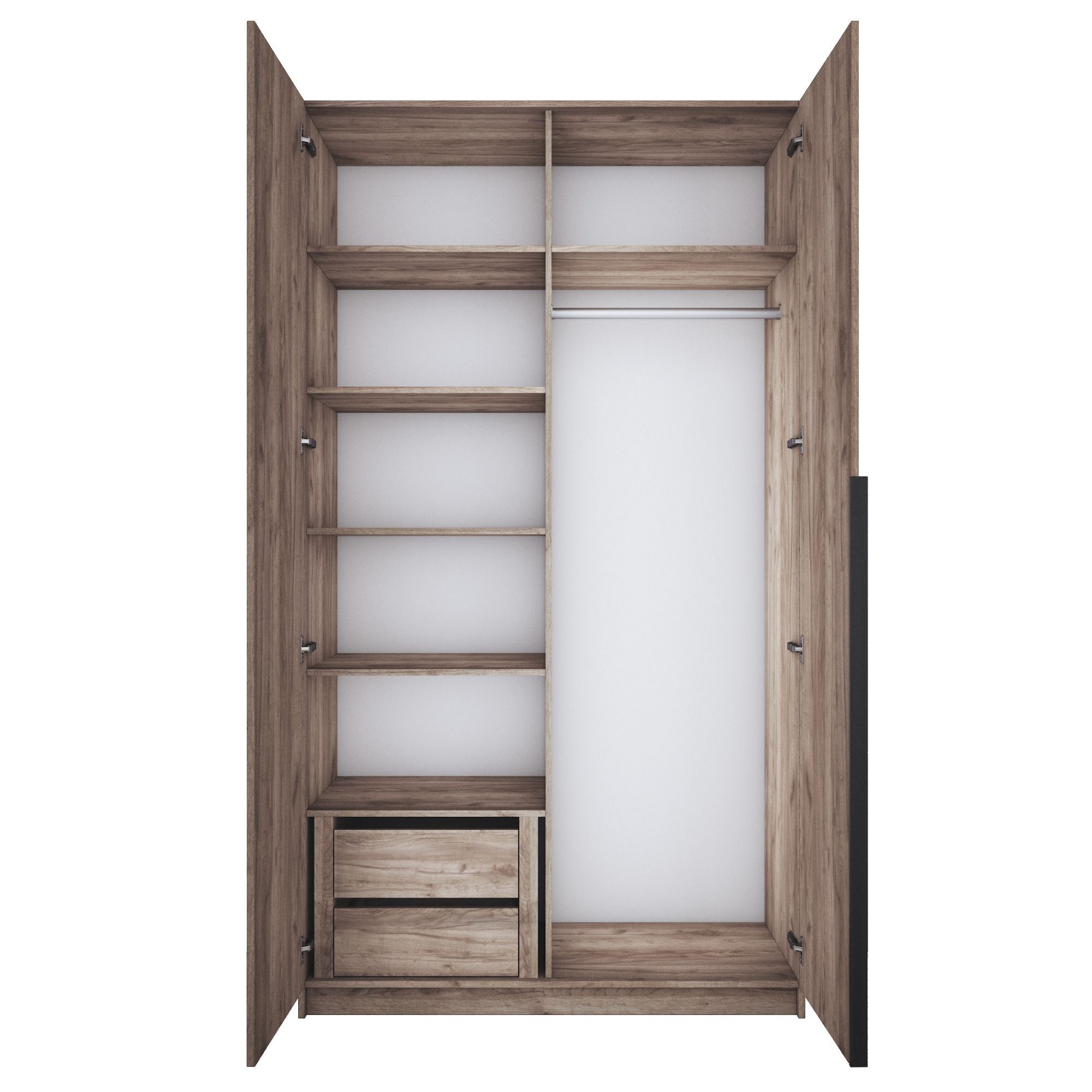 Благодаря надежным полкодержателям - штифтам, полки шкафа могут выдерживать до 15 кг, штанга выдерживает нагрузку до 60 кг. Вы сможете убрать сезонные вещи, постельное белье на верхние полки. Распашной шкаф оснащен долговечной, ударостойкой кромкой ПВХ, которая защищает его торцы от сколов и повреждений, что обеспечит вам комфортное и долгое использование гардероба. Распашная система дверей Titus B-Type обеспечивает надежное прилегание дверцы к корпусу шкафа и высокую износостойкость. Механизм не деформируется при значительных нагрузках и максимально практичен в эксплуатации. Шкаф оснащен удобной минималистичной ручкой, изготовленной из алюминия. В производстве используется безопасное ЛДСП международного класса Е1, что способствует безопасному использованию на протяжении всего срока эксплуатации.