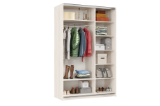 Задняя стенка - облагороженная ДВП белого цвета . Верхние и нижние крышки шкафа крепятся к боковинам евровинтами, а внутренние ""вязущие"" - эксцентриковыми стяжками. Бельевое отделение расположено в правой части шкафа-купе, полки устанавливаются на полкодержателях Sekura, Шкаф укомплектован опорами, позволяющими отрегулировать положение подвесных фасадов.