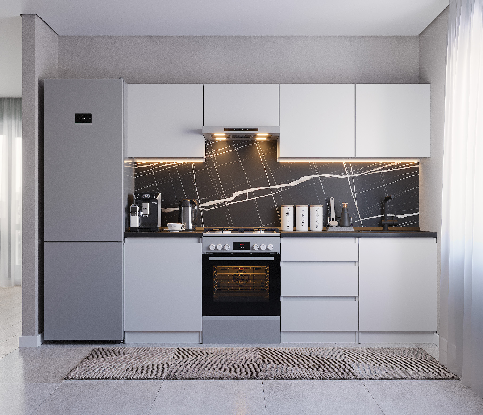 Кухня Леон сочетает в себе функциональность, стиль и доступность, и является прекрасным выбором для тех, кто ищет компактное и удобное решение для своей кухни. Кухонный гарнитур Леон идеально подходит для помещений с ограниченным пространством. Корпус и фасады выполнены из белого ЛДСП. Фасады столов и шкафов не имеют лицевой фурнитуры и открываются захватом за тыльный край фасада. Леон смотрится современно, а отсутствие ручек упрощает уход за поверхностью.