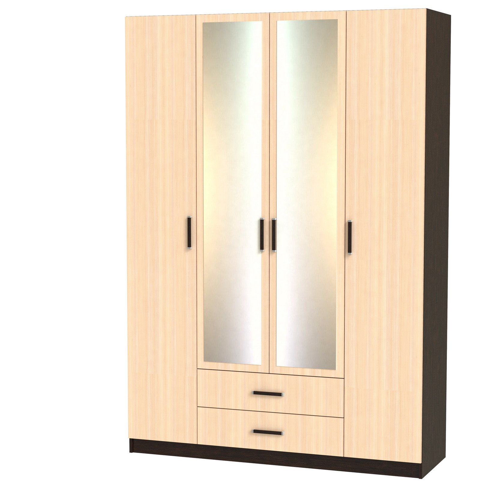 Феникс М-15 Корпус шкафа выполнен из Ламинированной ДСП высокого качества с насыщенным цветом..В данной моделе используются зеркала, .Шириною 140 см., красивый и удобный четырехстворчатый шкаф. По бокам слева и справа секции, по четыре полки в каждой. В центре сверху узкая ниша, под ней большая секция со штангой для одежды. В самом низу два выдвижных ящика. Два зеркала в данной моделе уже включены в стоимость.