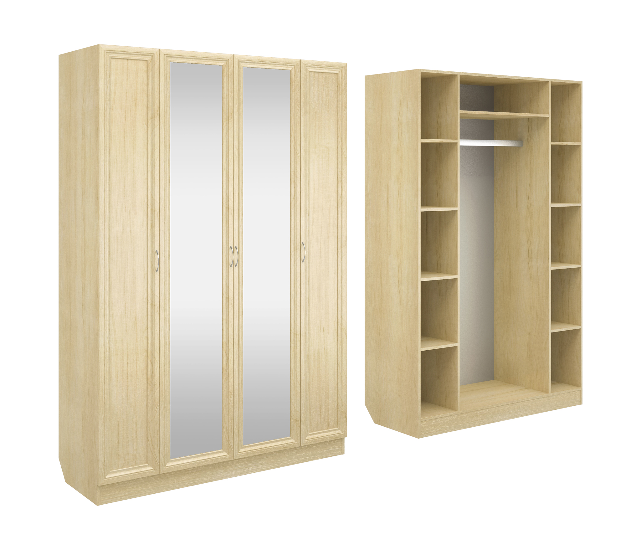Корпус шкафа выполнен из Ламинированной ДСП высшего качества с насыщенным цветом. Фасады выполнены из материала МДФ.Шириною 140 см., модель с четырьмя створками. Слева и справа секции, по четыре полки в каждой. В центре узкая ниша, а под ней большая секция со штангой. Два зеркала в данной моделе так же включены в стоимость.В данной моделе используются зеркала, которые внедрены в рамки фасадов.