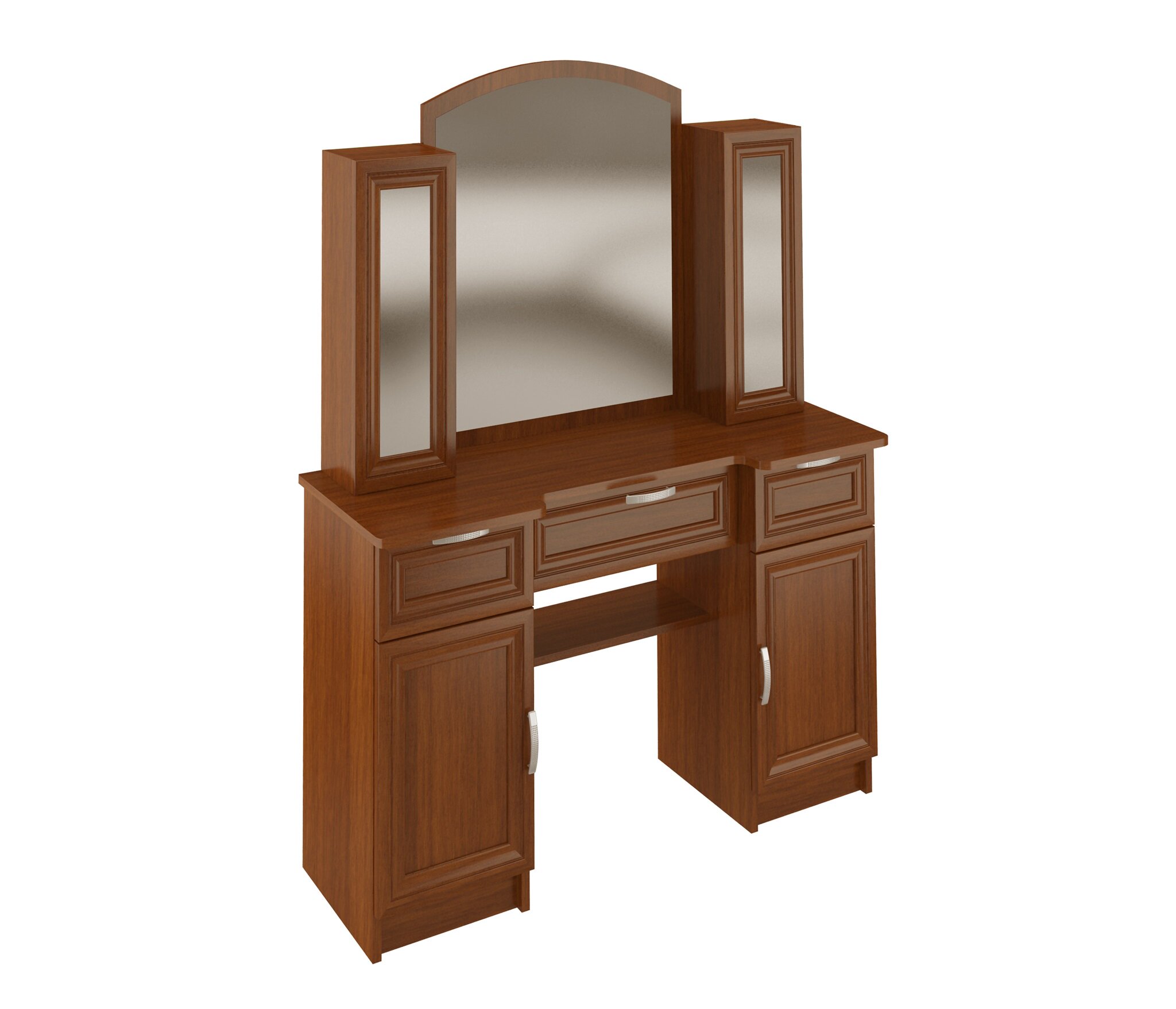 Корпус туалетного столика выполнен из Ламинированной ДСП высшего качества с насыщенным цветом. Рамка фасадов в плёнке МДФ.В комплект входит вся необходимая фурнитура.Удобный и функциональный в использовании.По бокам зеркальные дверцы открываются за которыми полочка,позволяющая хранить мелкие вещи.Оснащён 3-мя выдвижными ящиками и под ними ниша для хранения с дверцами.