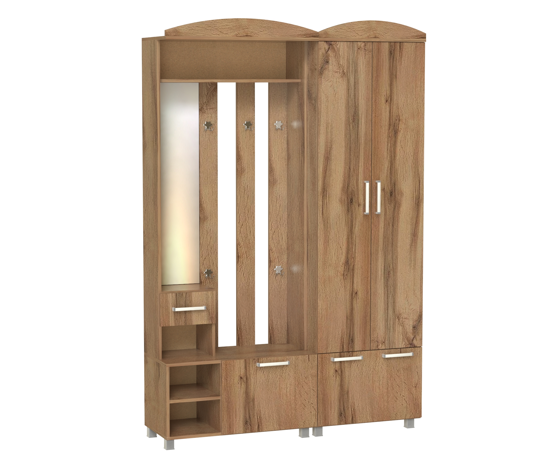 Корпус и фасады прихожей выполнен из Ламинированной ДСП высшего качества с насыщенным цветом. .Шириною 140 см., это небольшой комплект из двух модулей, тумбы-вешалки и шкафа. В шкафу две распашные двери и одна откидная. Во втором модуле небольшое, но высокое зеркальце над маленьким ящиком. Имеются три ниши рядом с откидной дверью. На вешалке пять двойных крючков. Прихожая Шк-7 самое лучшее решение и идеально подходит как для не больших помещений, так и для средних.
