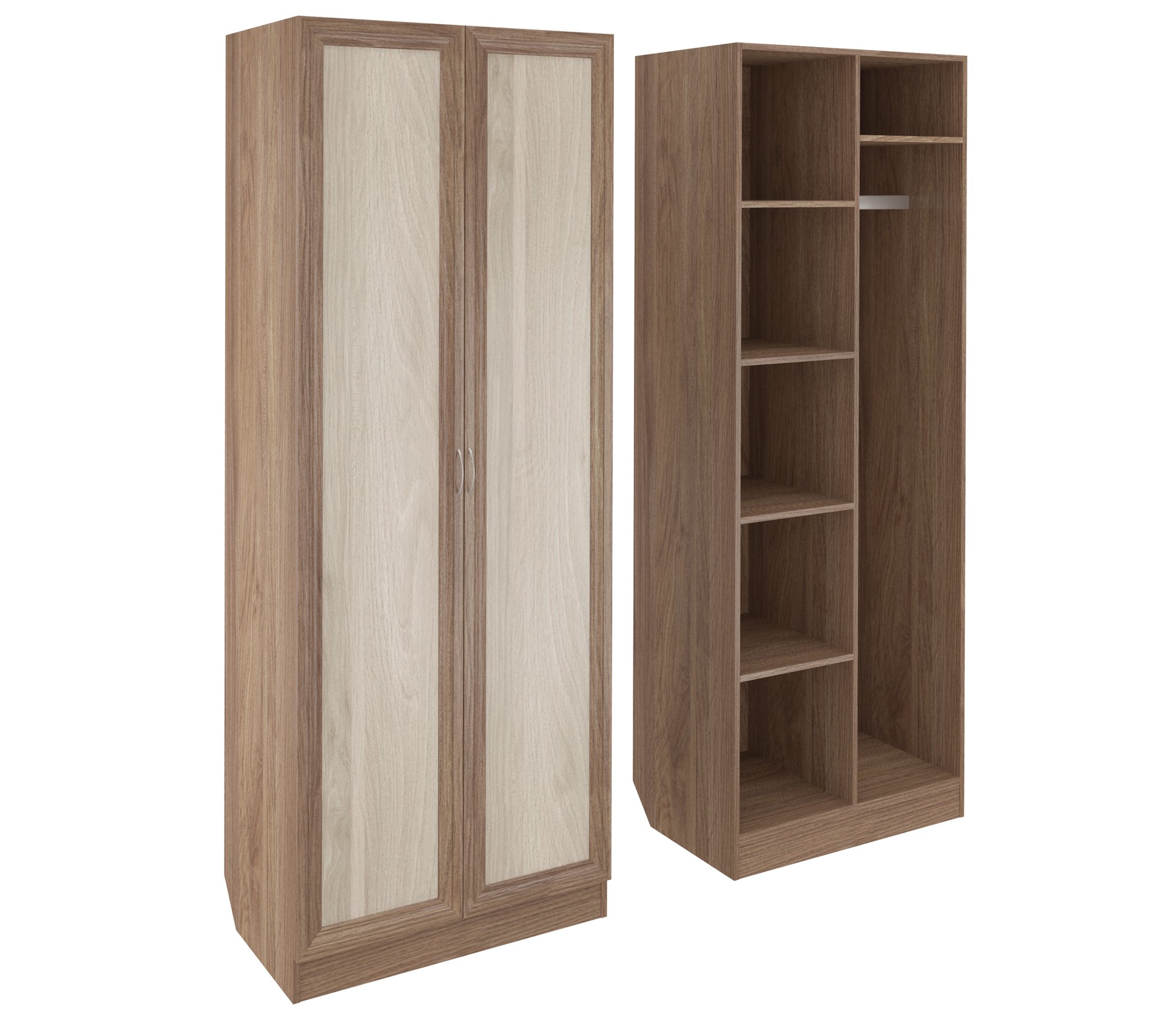 Корпус шкафа выполнен из Ламинированной ДСП высокого качества с насыщенным цветом. Фасады выполнены из материала МДФ.Шириною 80 см., это классический шкаф для верхней одежды, несет в себе следующие элементы. За распашными дверьми с одной стороны отделение с четырьмя полками, с другой штанга для одежды и узкая ниша над ней.