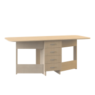 В основании стола расположена тумбочка с четырьмя выдвижными ящиками одинаковой вместимости.