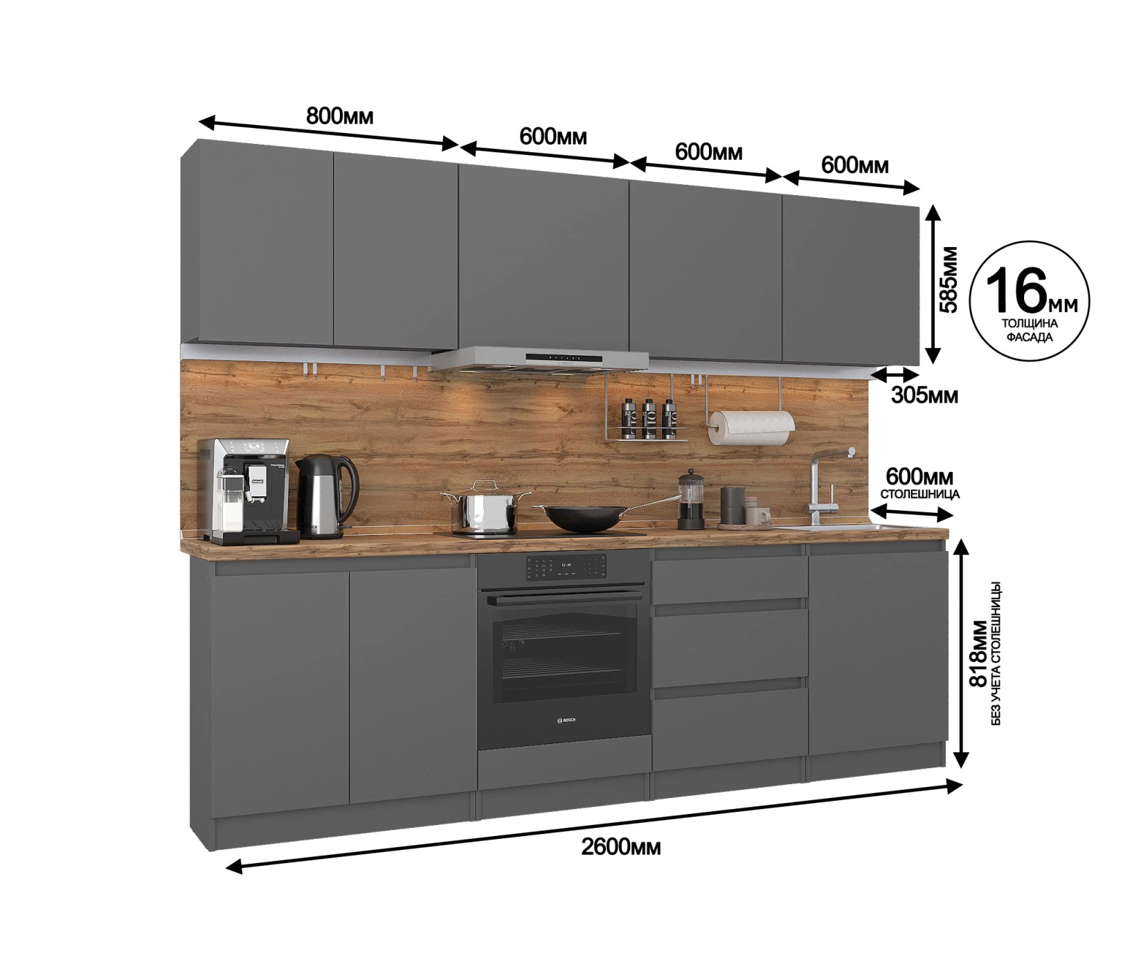Длина кухни 2,6 метра она идеально подходит для помещений с ограниченным пространством.