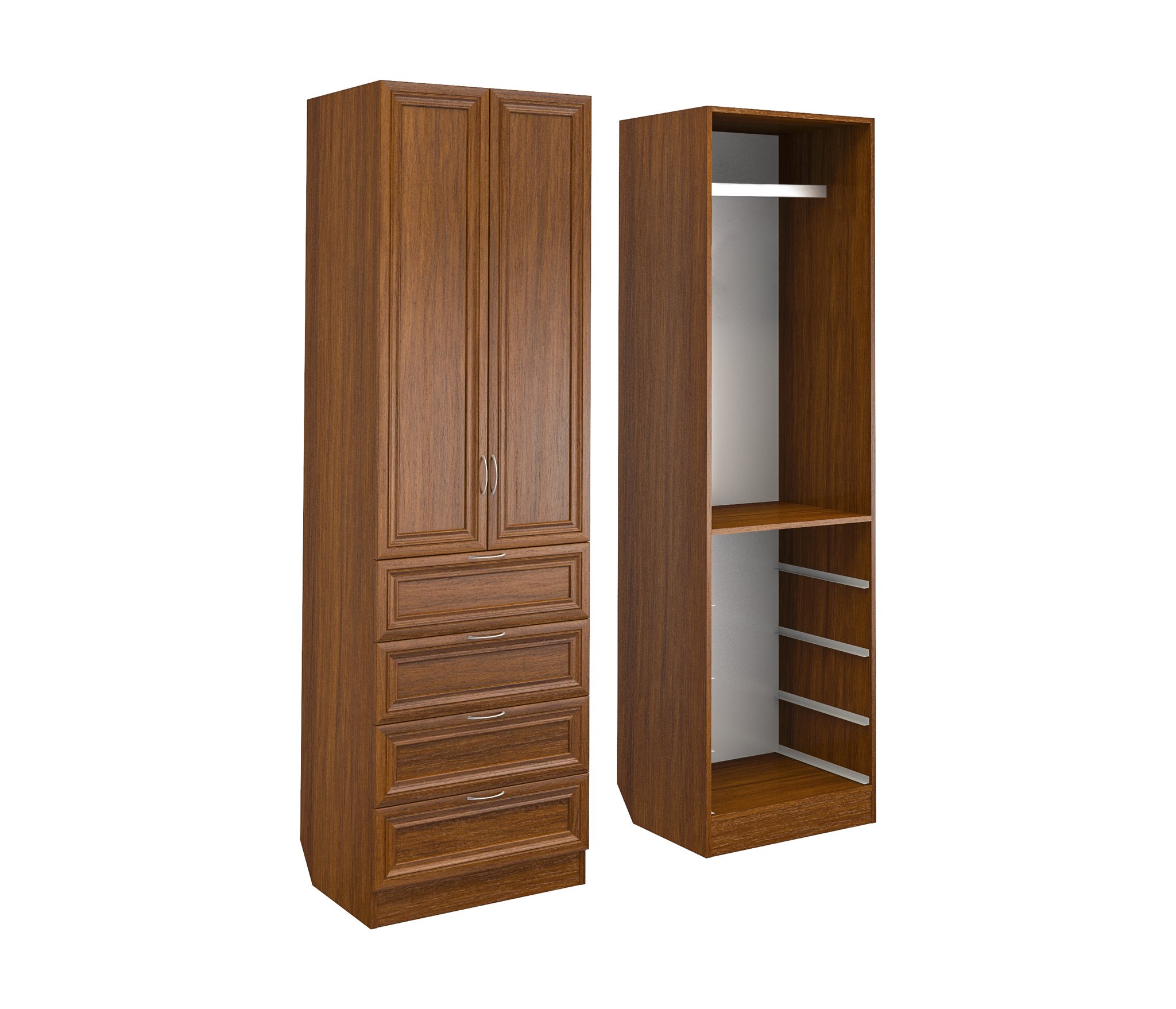 Корпус шкафа выполнен из Ламинированной ДСП высокого качества с насыщенным цветом. Фасады выполнены из материала МДФ.Шириною 60 см., эта многофункциональная модель несет в себе следующие элементы. За распашными дверьми штанга для одежды, вверху ниша. Снизу четыре выдвижных ящика.