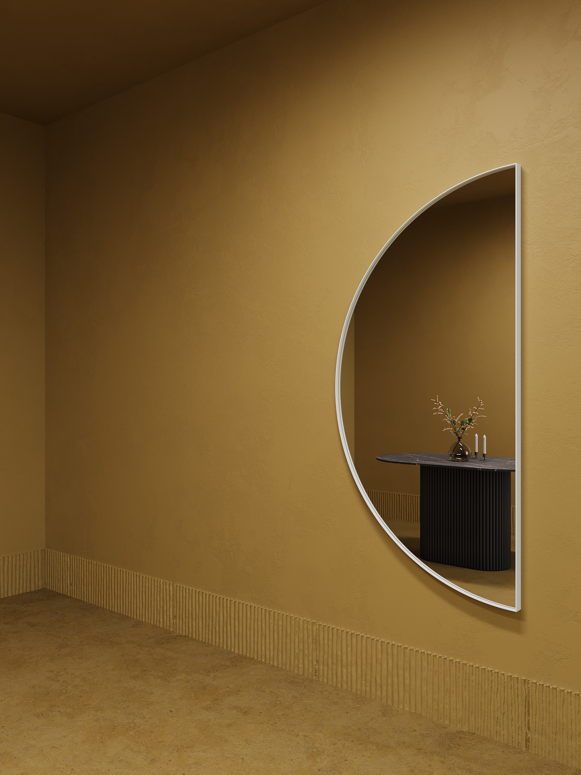 RONTUS M – это уникальное зеркало в форме полукруга с металлической рамой, которое отличается не только стильным дизайном, но и своей практичностью. Рама достаточно изящна, чтобы не перегружать композицию, но в то же время достаточно крепкая, чтобы надёжно фиксировать зеркальное полотно. Выступ рамы в 15 мм добавляет зеркалу объёмности, делая его визуально более интересным и привлекательным.