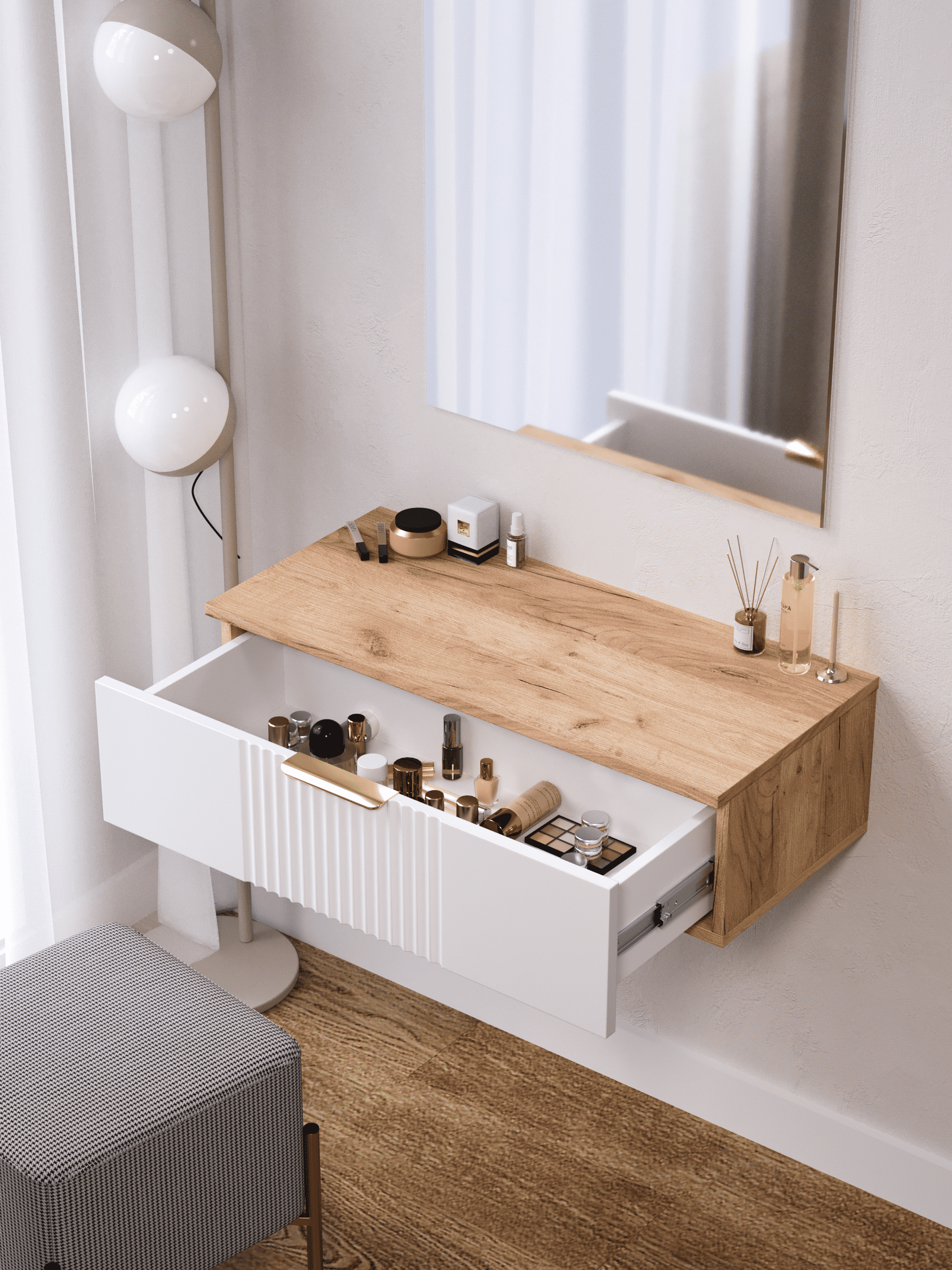 Стильный и практичный Туалетный столик Ингрия Luxe с ящиками, решит как минимум две ваших задачи, будет служить многофункциональной нишей для хранения вещей, и универсальной подставкой для различных предметов интерьера. Наша модель Ингрия Luxe российского производства выглядят легко и современно, идеально впишется в лофт, скандинавский, современный, минимализм и прочие популярные стили интерьеров. Его минималистичный дизайн придадут легкость и простор всему вашему интерьеру. Компактный туалентный столик сэкономит пространство и организует грамотное хранение вещей. Имеет выдвижной ящик. За удобство и комфорт открывания ящика отвечают шариковые направляющие (без доводчиков), с полным выдвижением и системой открывания Push-to-Open . Ящики с такой системой открывания будут ходить практически бесшумно, и выдвигаться полностью, даже при повышенной нагрузке. За высокопрочность и долговечность отвечает корпус, выполненный из ЛДСП, подходит для активного использования. За эстетику и лаконичность дизайна отвечает фасад из МДФ созданный путем сложной фрезеровки в виде 3D рисунка.