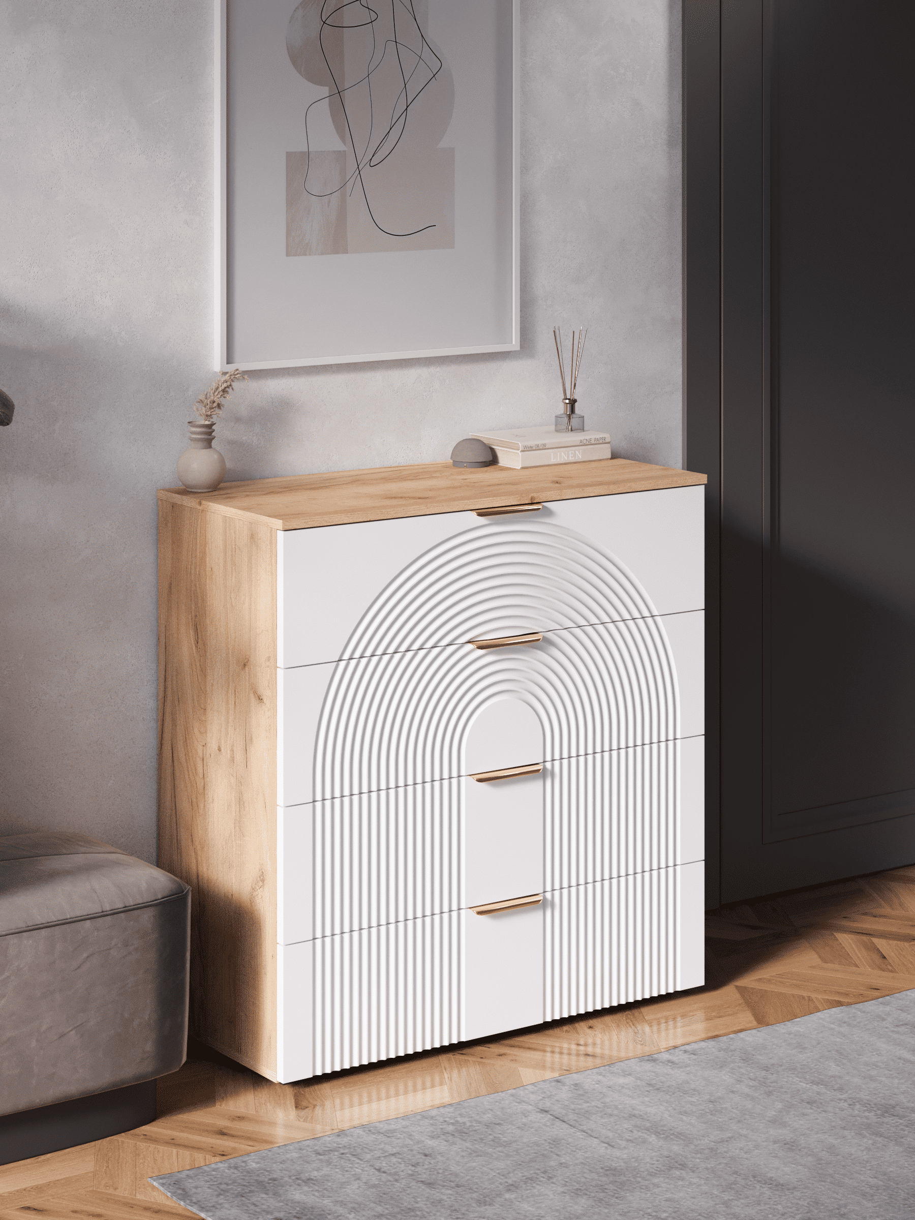 Стильный и практичный комод с ящиками, решит как минимум две ваших задачи, будет служить многофункциональной нишей для хранения вещей, одежды, белья и универсальной подставкой для различных предметов интерьера, а также можно использовать в виде тумбы под телевизор. Наша коллекция Ингрия российского производства выглядят легко и современно, идеально впишется в лофт, скандинавский, современный, минимализм и прочие популярные стили интерьеров. Его минималистичный дизайн придаст легкость и простор всему вашему интерьеру. Комод компактный и сэкономит пространство и организует грамотное хранение вещей. Комод имеет 4 выдвижных ящика. За удобство и комфорт открывания ящиков отвечают шариковые направляющие (без доводчиков), с полным выдвижением. Ящики с такой системой открывания будут ходить практически бесшумно, и выдвигаться полностью, даже при повышенной нагрузке. Ножки изготовлены из прочного массива дерева. Комод изготовлен из материалов высокого качества. За высокопрочность и долговечность отвечает корпус, выполненный из ЛДСП, подходит для активного использования. За эстетику и лаконичность дизайна отвечает фасад из МДФ созданный путем сложной фрезеровки в виде 3D рисунка. Накладные алюминиевые ручки для комода подчеркнут монолитный образ. Комод поставляется в разобранном виде, пусть это вас не пугает. В комплекте предусмотрены все необходимые комплектующие, подробная инструкция и фурнитура. Сборка комода серого с ящиками не потребует особых навыков и не отнимет много времени. Современная мебель для дома должна не только брать на себя пару задач по организации пространства, но и гармонично смотреться, выполняя нужные нам функции. Поэтому комод можно использовать в разных помещениях в гостиной, спальне, прихожей (коридоре), в детской для игрушек, в офисе, в салоне красоты, на балконе. Комод для вещей справится со всеми возложенными на него функциями. Перед отправкой мебели, каждое изделие проходит проверку на наличие брака. Для целостности и сохранности каждого изделия мы разработали усиленную, надежную упаковку. Европейское качество от российского производителя - по доступным ценам.