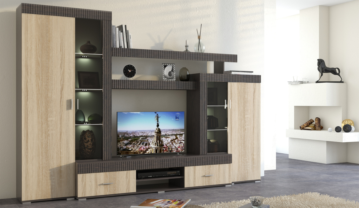 Марк - это готовое решение для гостиной и спальни в современном европейском стиле.Благодаря тщательно продуманной конструкции и правильному подбору цветов, позволяет создать уютную и теплую обстановку для отдыха и содержания дома в порядке.Отличительные особенности: утолщенные линии из рельефного МДФ, тонированные витрины со стеклянными полками, множество места для хранения при небольших размерах.