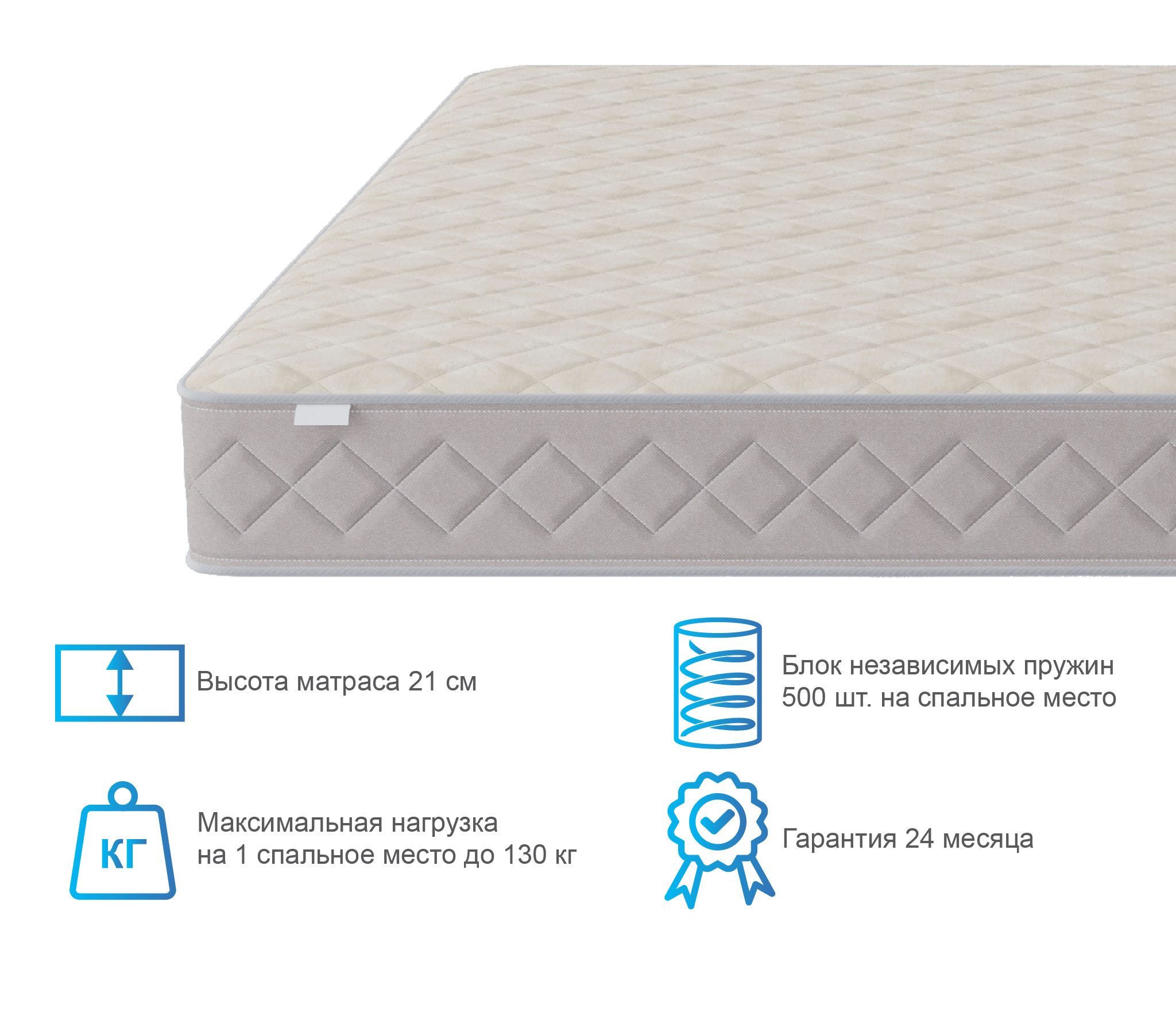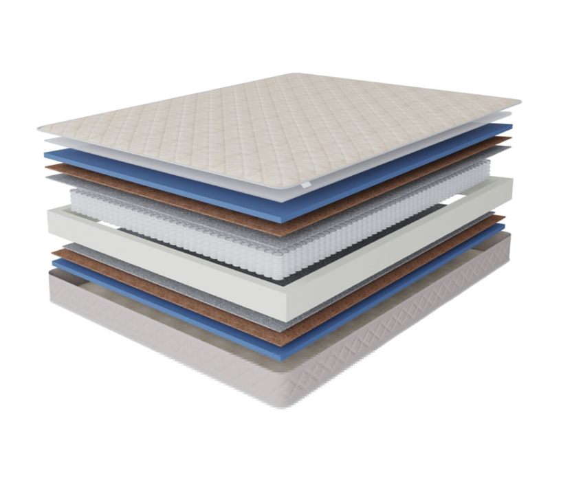 Это классическая конструкция матраса, универсальный блок пружин с точечной поддержкой, термоволокно, которое защитит комфортные слои от соприкосновения с пружинами и соответственно истерания. Слои кокоса добавят необходимой жесткости и прочности.