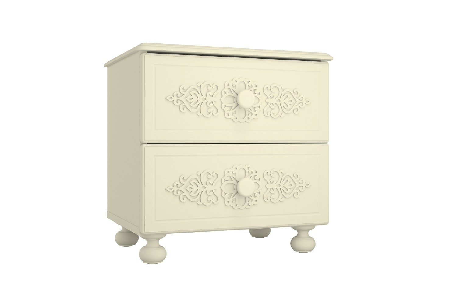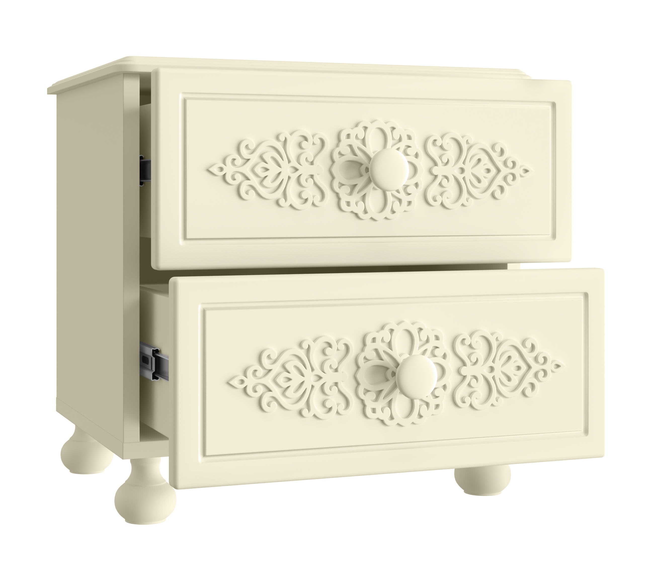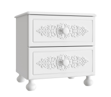 Прикроватная тумба с двумя выдвижными ящиками. Высота боковых стенок каждого ящика 120 мм, ширина ящика 340 мм, глубина 300мм. Ящики установлены на телескопических направляющих полного выдвижени