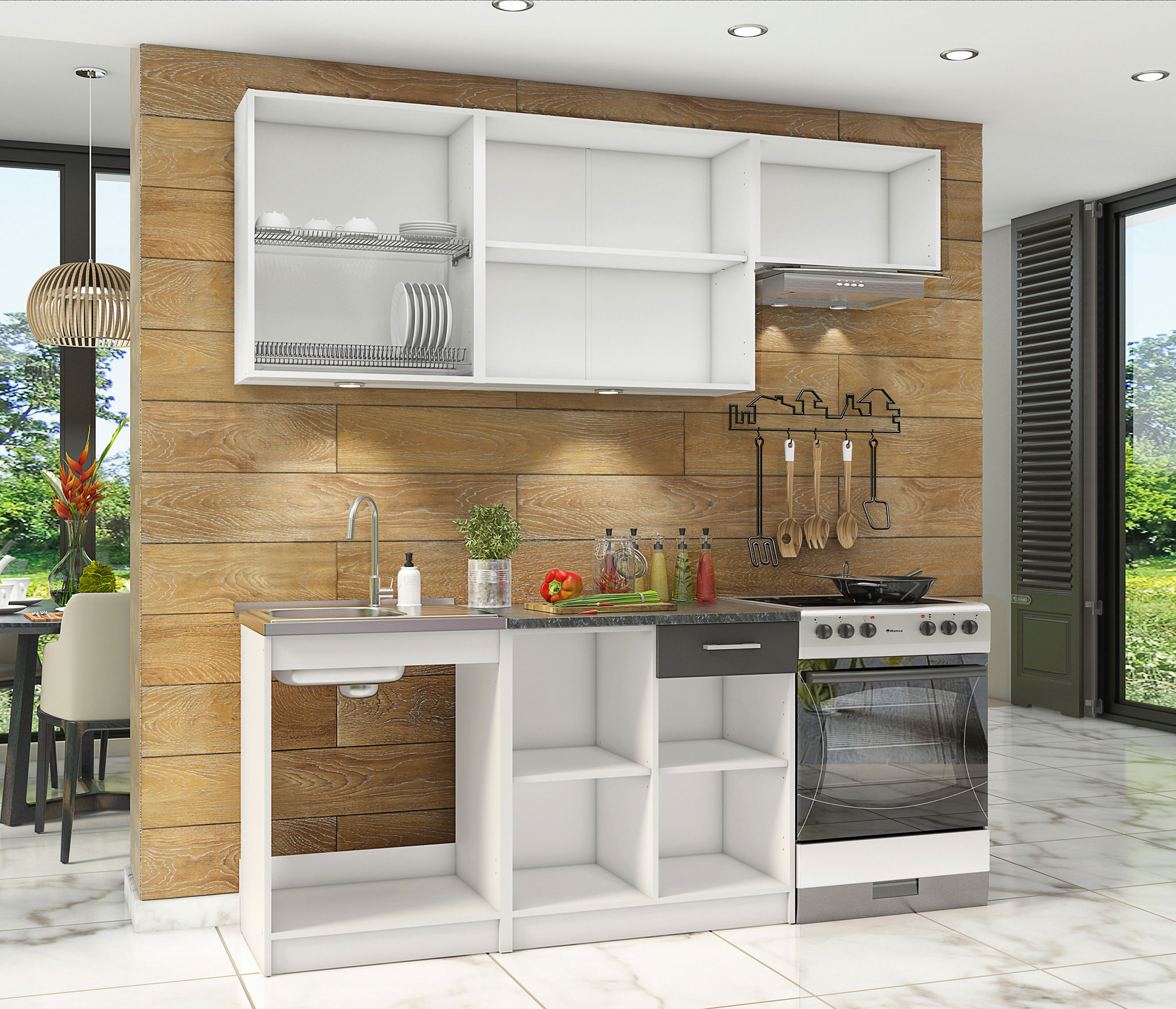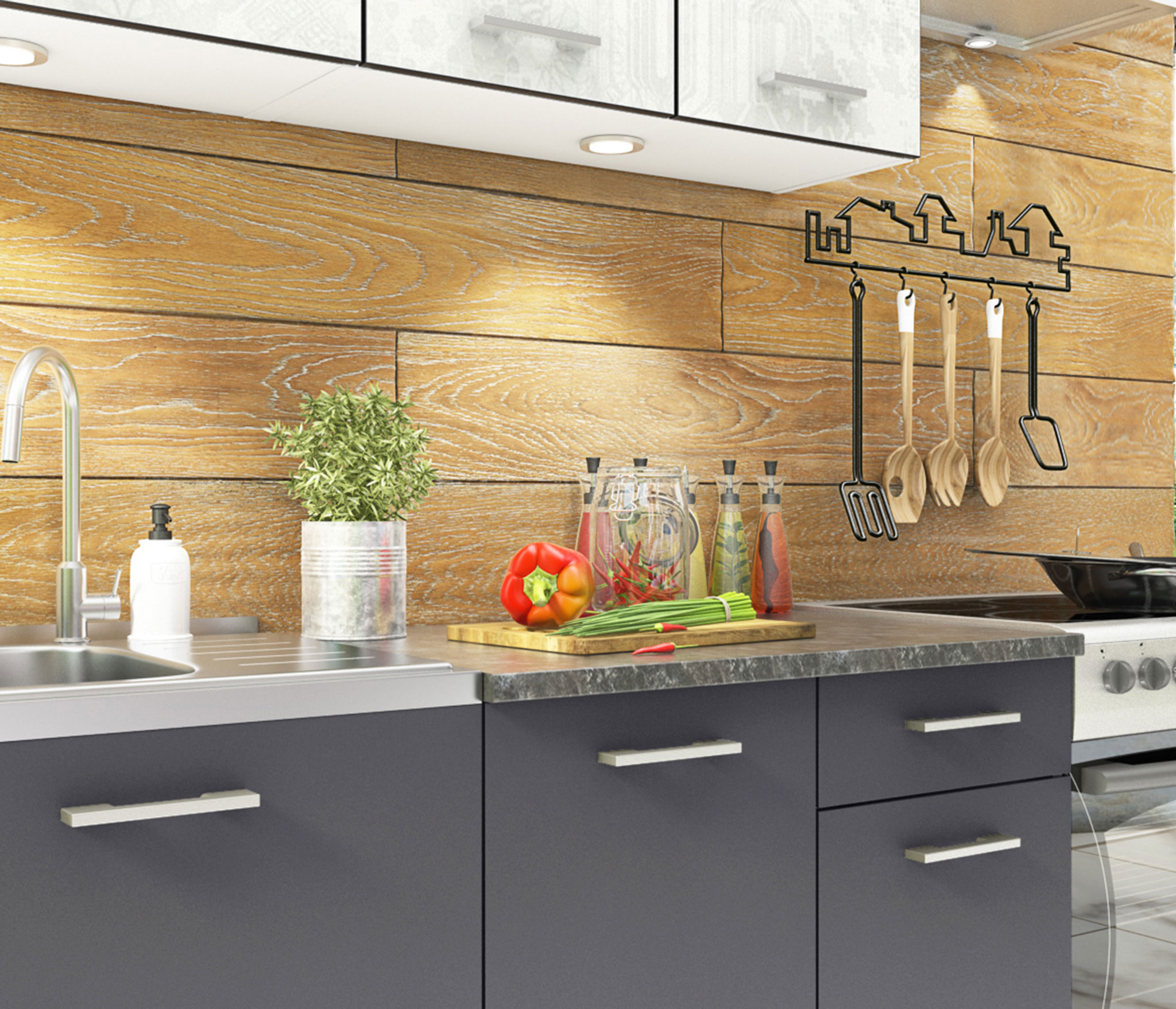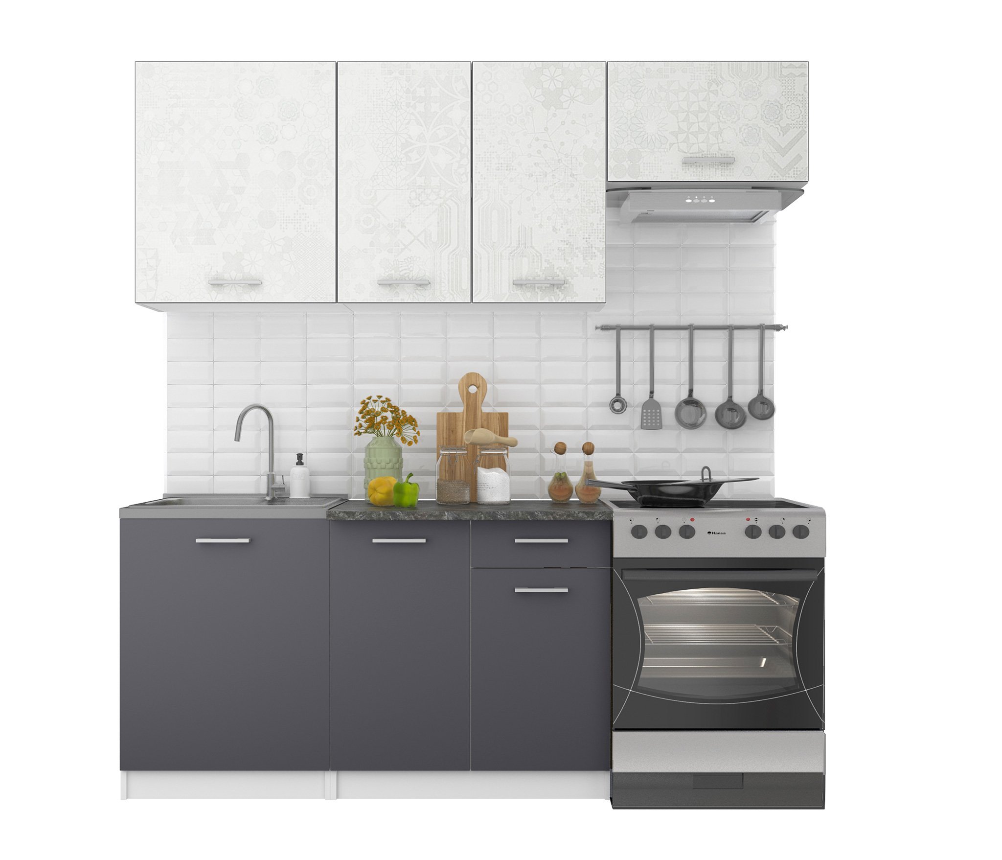Кухонный гарнитур "Бланка" идеально подходит для молодых людей благодаря своему стильному исполнению, компактности и невысокой цене. Дополнить дизайн поможет стеновая панель.