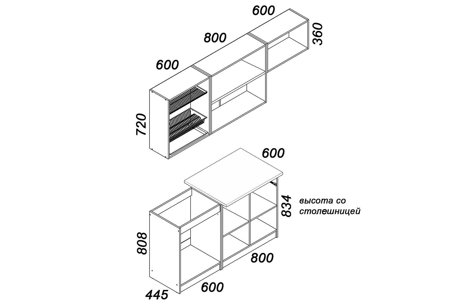 Рекомендуется установка накладной мойки шириной 600 мм (в комплект не входит).