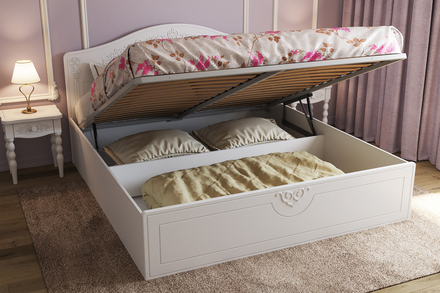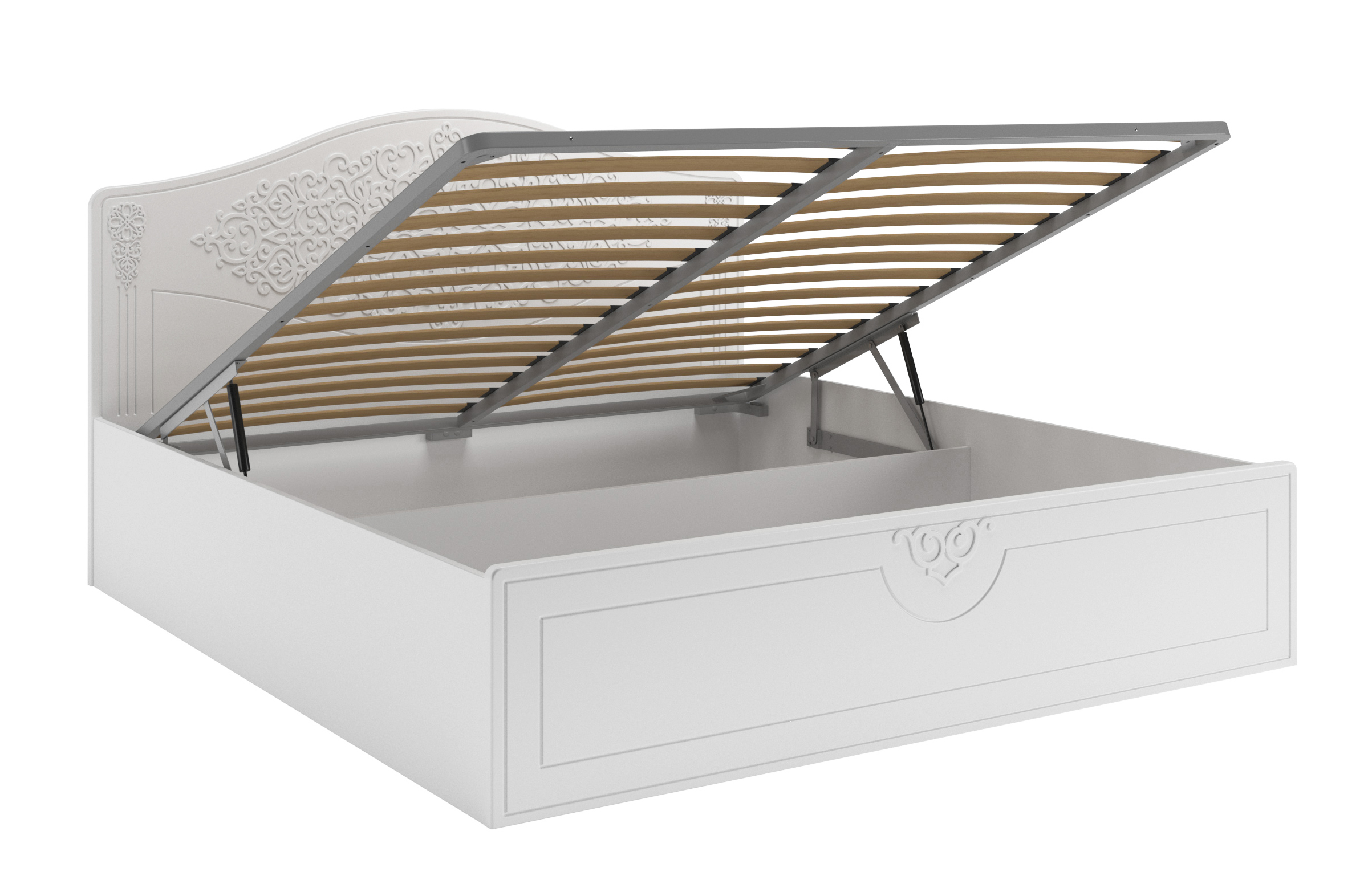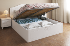 Кровать оснащена подъемным механизмом, обеспечивающим доступ в короб для хранения постельного белья. С двуспальной кроватью идеально подходит банкетка АС-34 для размещения рядом (в ногах).