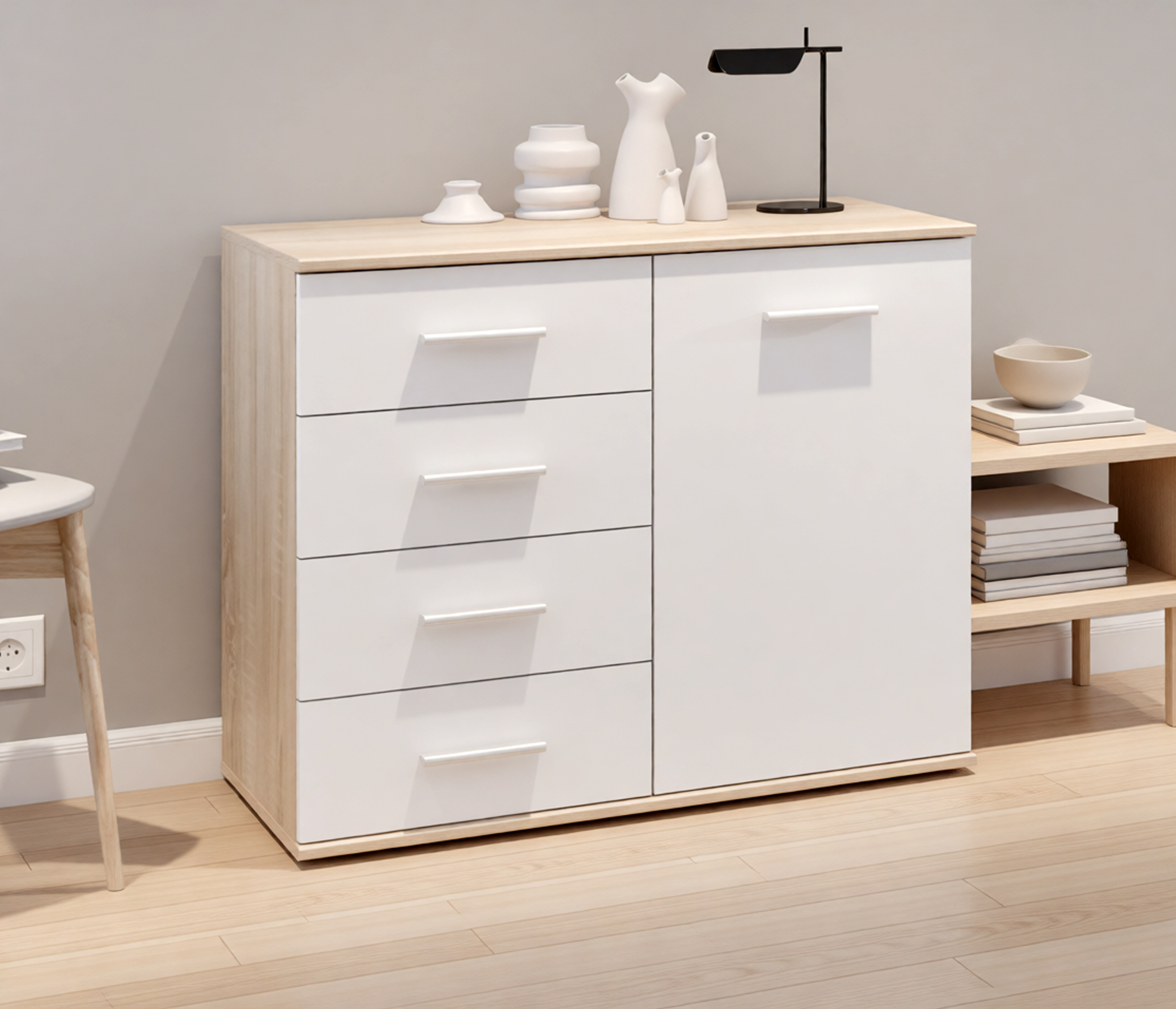 Выполнен комод Мамбо из современного материала. Основной цвет отделки -- «Дуб Сонома», а фасады выдвижных ящиков имеют белое матовое покрытие.