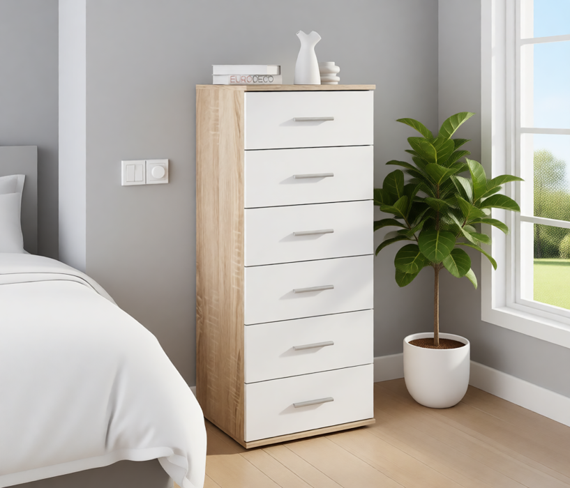 Комод Мамбо имеет довольно компактные габариты -- ширина 50 см, высота 121 см и глубина 44 см. Однако его обладатели никогда не жаловались на вместительность. В шести выдвижных ящиках можно разместить множество нужных вещей.