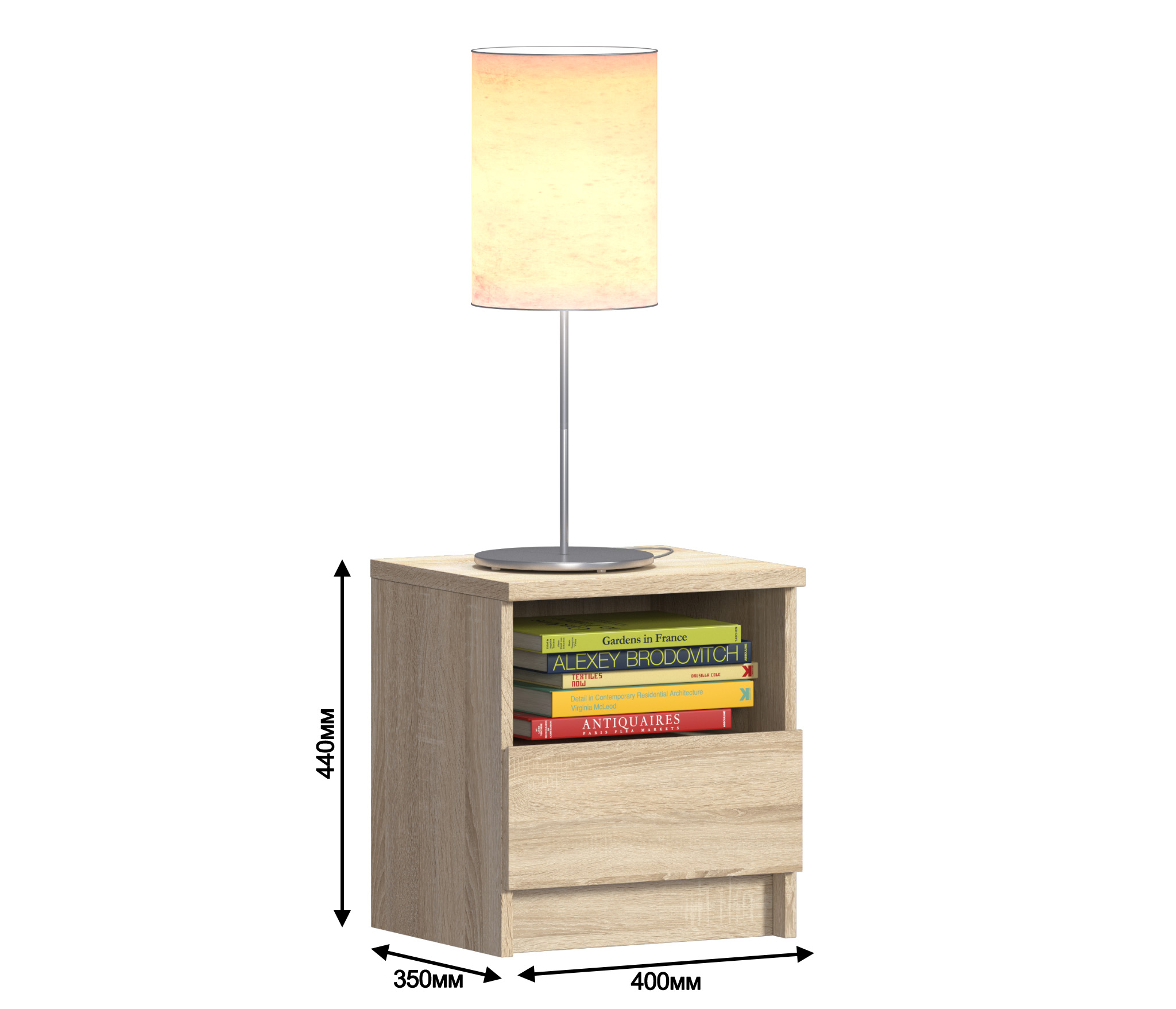 Габаритные размеры тумбы - ширина 40 см, высота 44 см, глубина 35 см, Один выдвижной ящик и открытое отделение, куда положить планшет или книгу. Стиль тумбы современный - Сканди, хай тек. Наиболее выигрышно тумба будет смотреться в интерьере в сочетании с другими предметами мебели из коллекции "Веста". Корпус и фасад тумбы выполнен из современного и прочного ЛДСП.