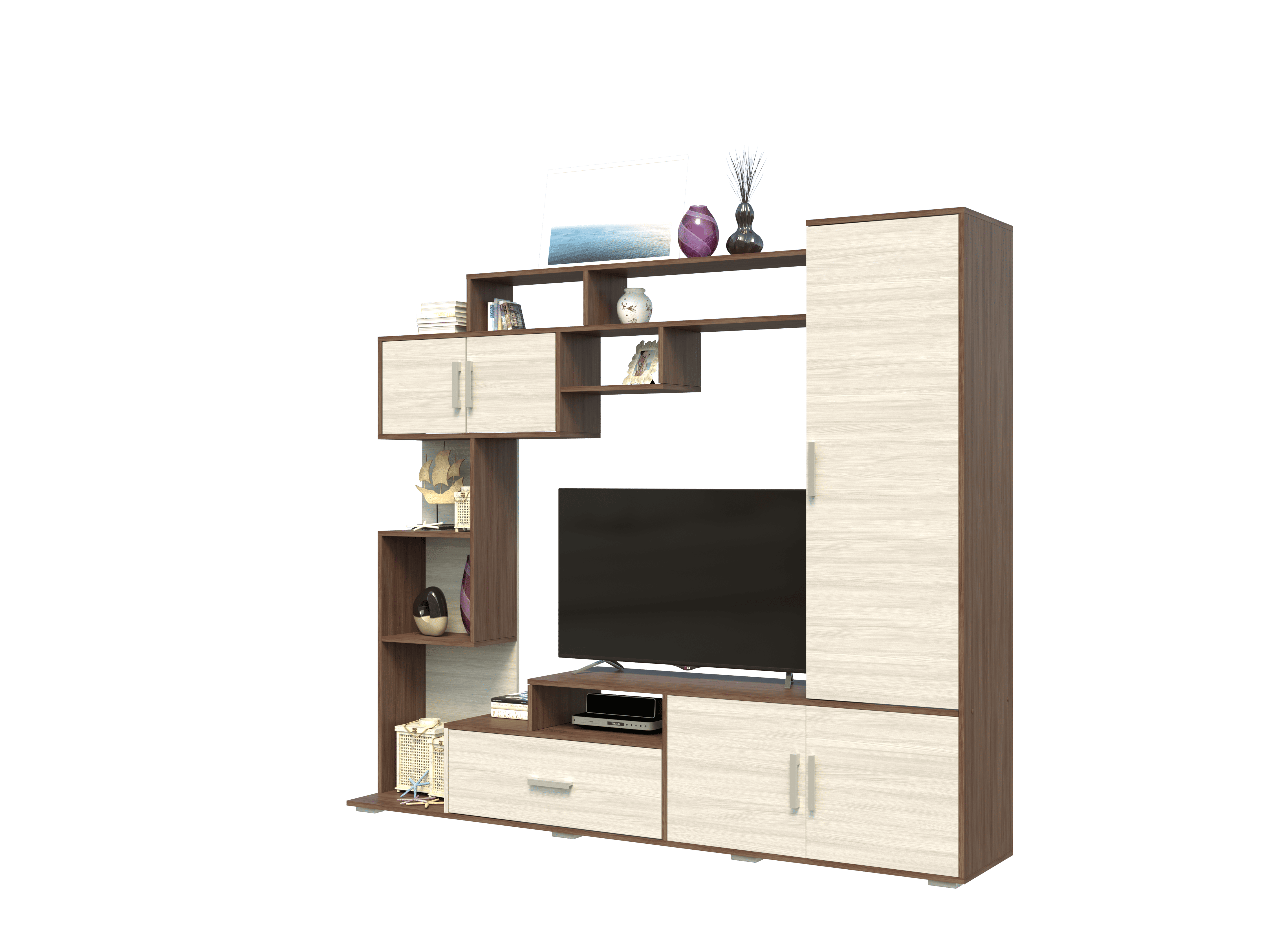 Конструкцией предусмотрен шкаф с полками для хранения одежды, постельного белья и других вещей. В основании располагаются открытые ниши и закрытые отделения. По периметру стенка имеет полки разных размеров для книг, фотографий, предметов интерьера и других мелочей.