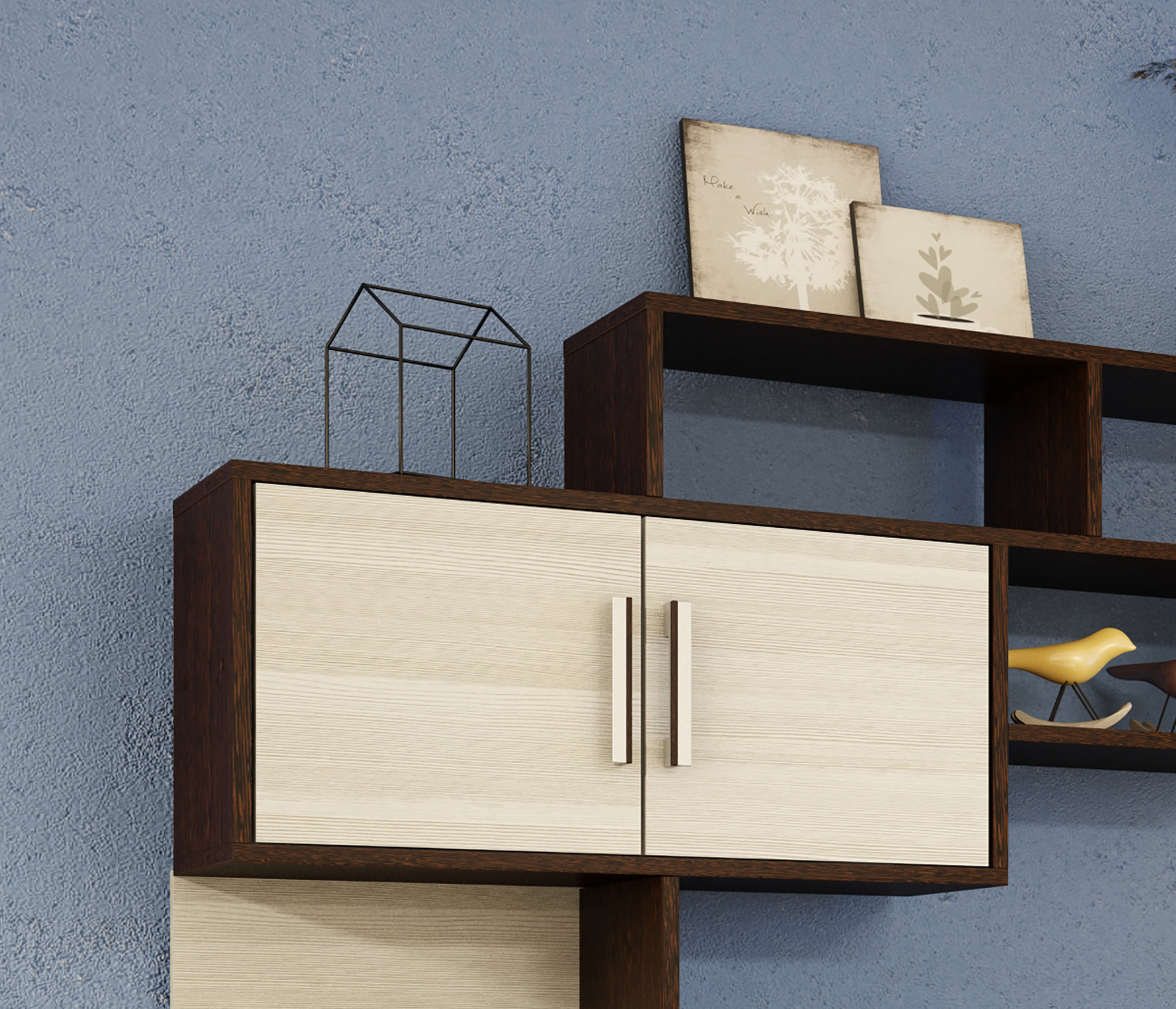 Конструкцией предусмотрен шкаф с полками для хранения одежды, постельного белья и других вещей. В основании располагаются открытые ниши и закрытые отделения. По периметру стенка имеет полки разных размеров для книг, фотографий, предметов интерьера и других мелочей.