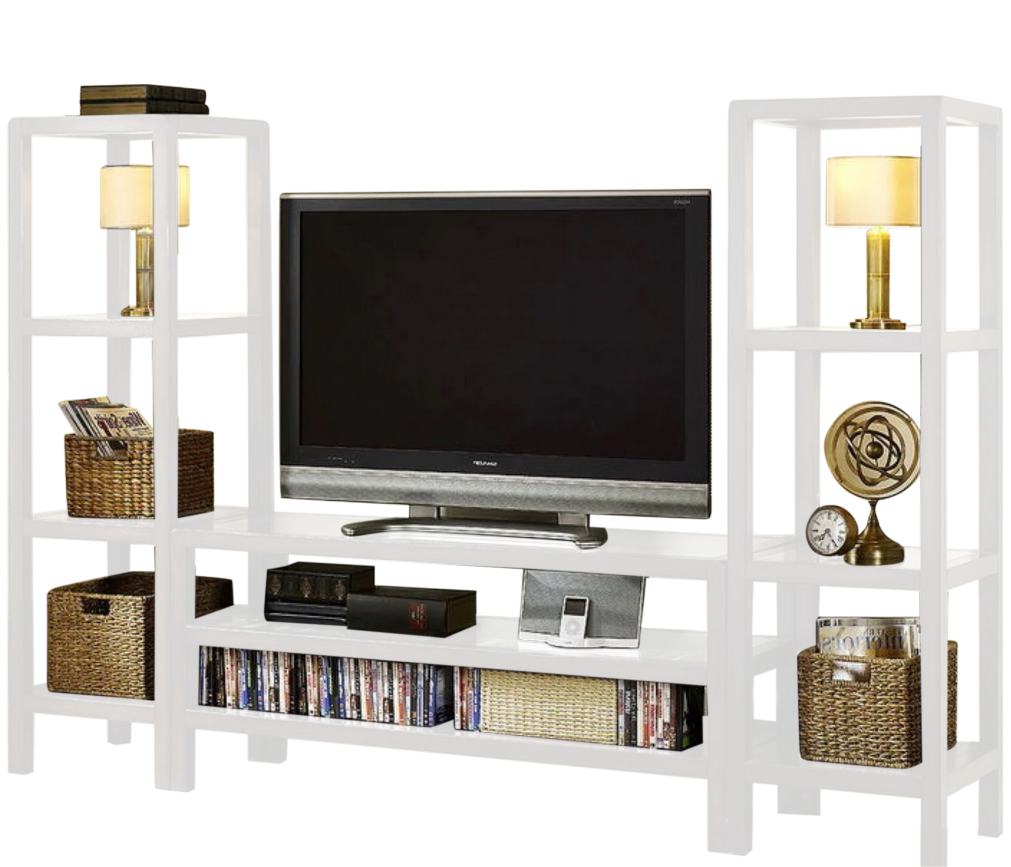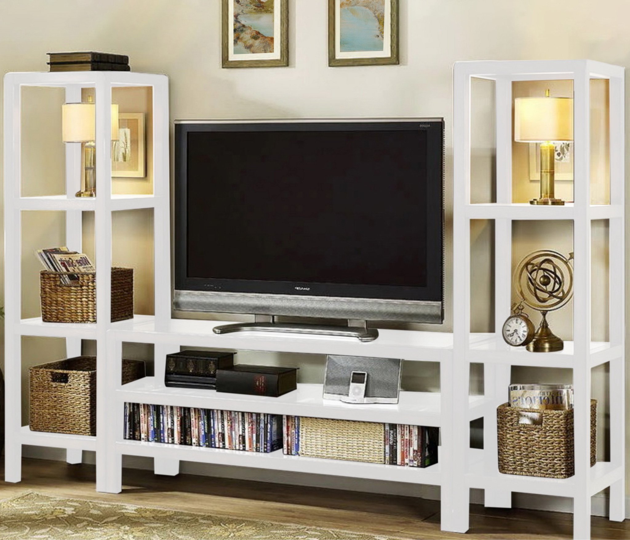 С ТВ тумбой , со стеллажом, глянцевые фасады, С полками