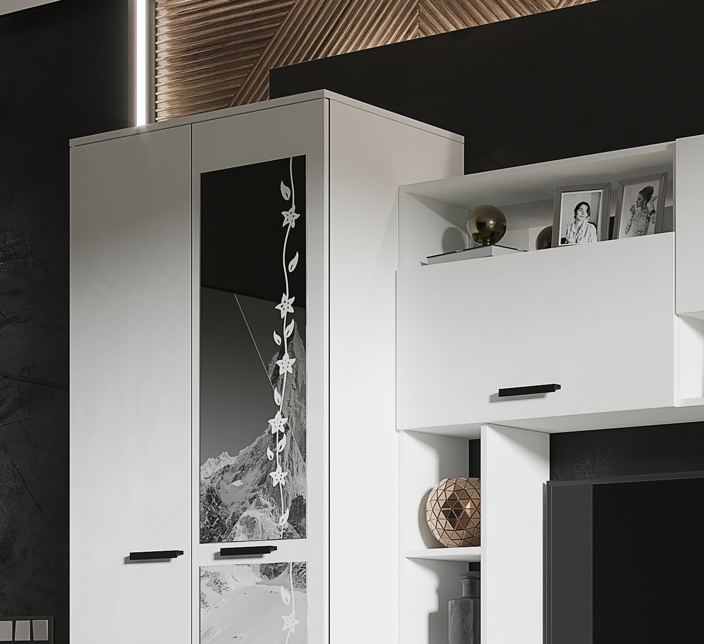 С ТВ тумбой , с витриной, со шкафом, С гравировка, Стекло, С полками