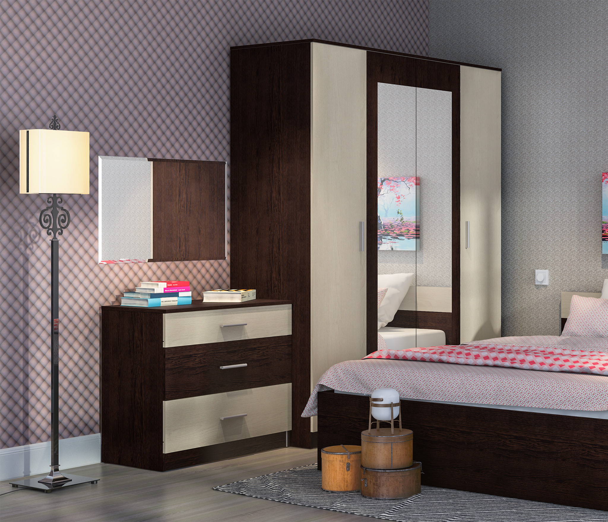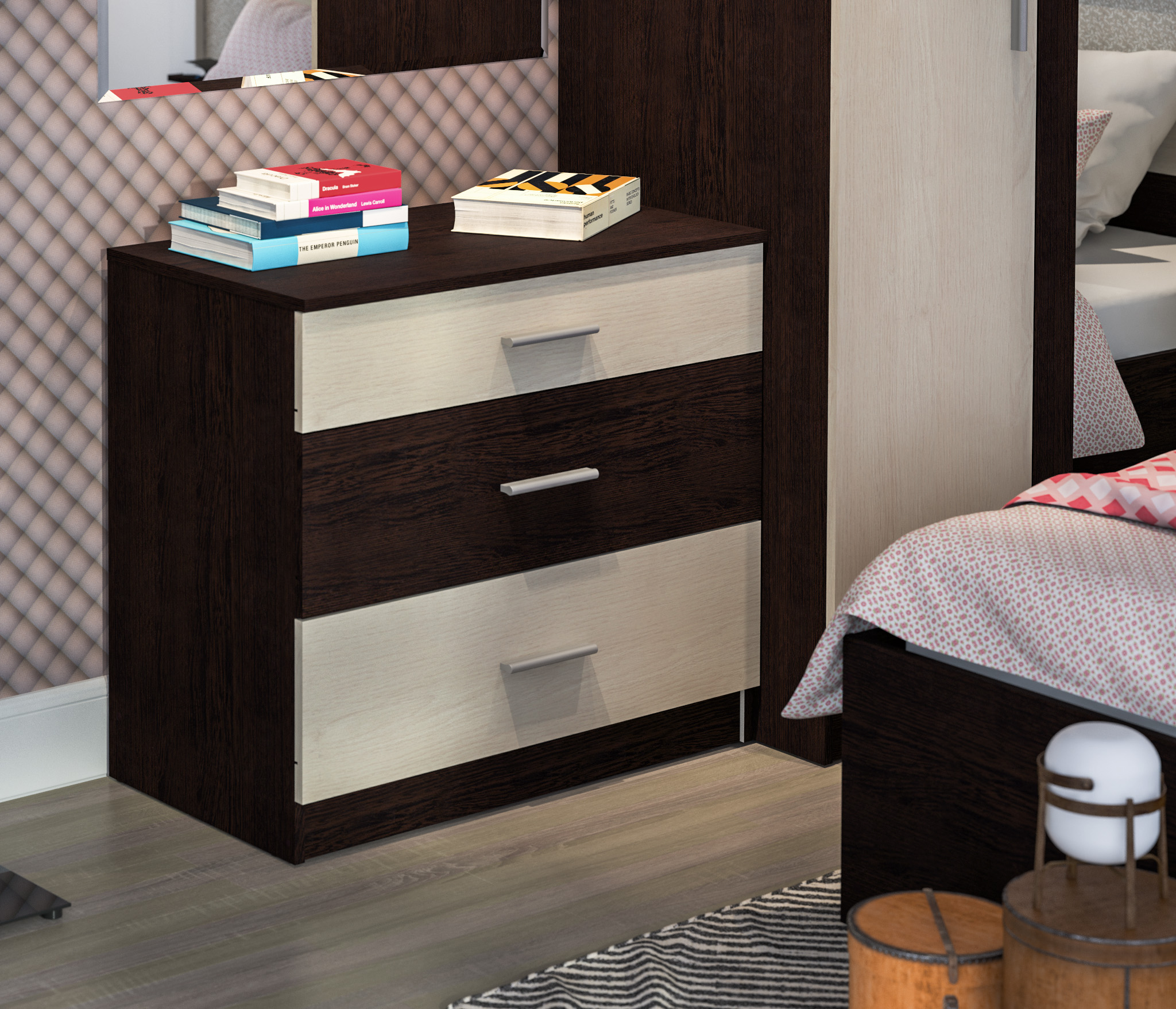 удобный и вместительный комод. покупали в комплекте со шкафом и тумбочкой из этой же серии. Все аккуратно было доставлено и собрано, за что отдельное спасибо.