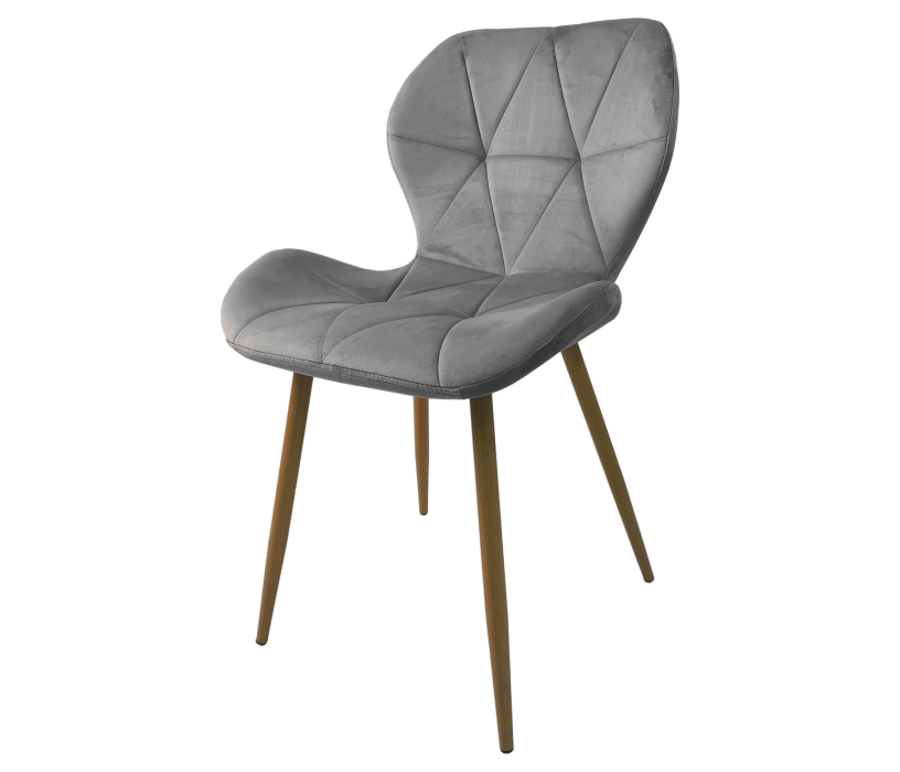 Обеденный стул с металлическими ножками, покрыт пленкой в цвет дерева. Сиденье и спинка имеют модную геометрическую форму. Изготовлены из фанеры с мягким слоем пенополиуретана, обиты бархатом, который чрезвычайно приятен на ощуп, устойчив к механическим повреждениям и легко очищается от грязи. Спинка сиденья наклонена под небольшим углом для удобной посадки. Размер: 540*500*770мм.