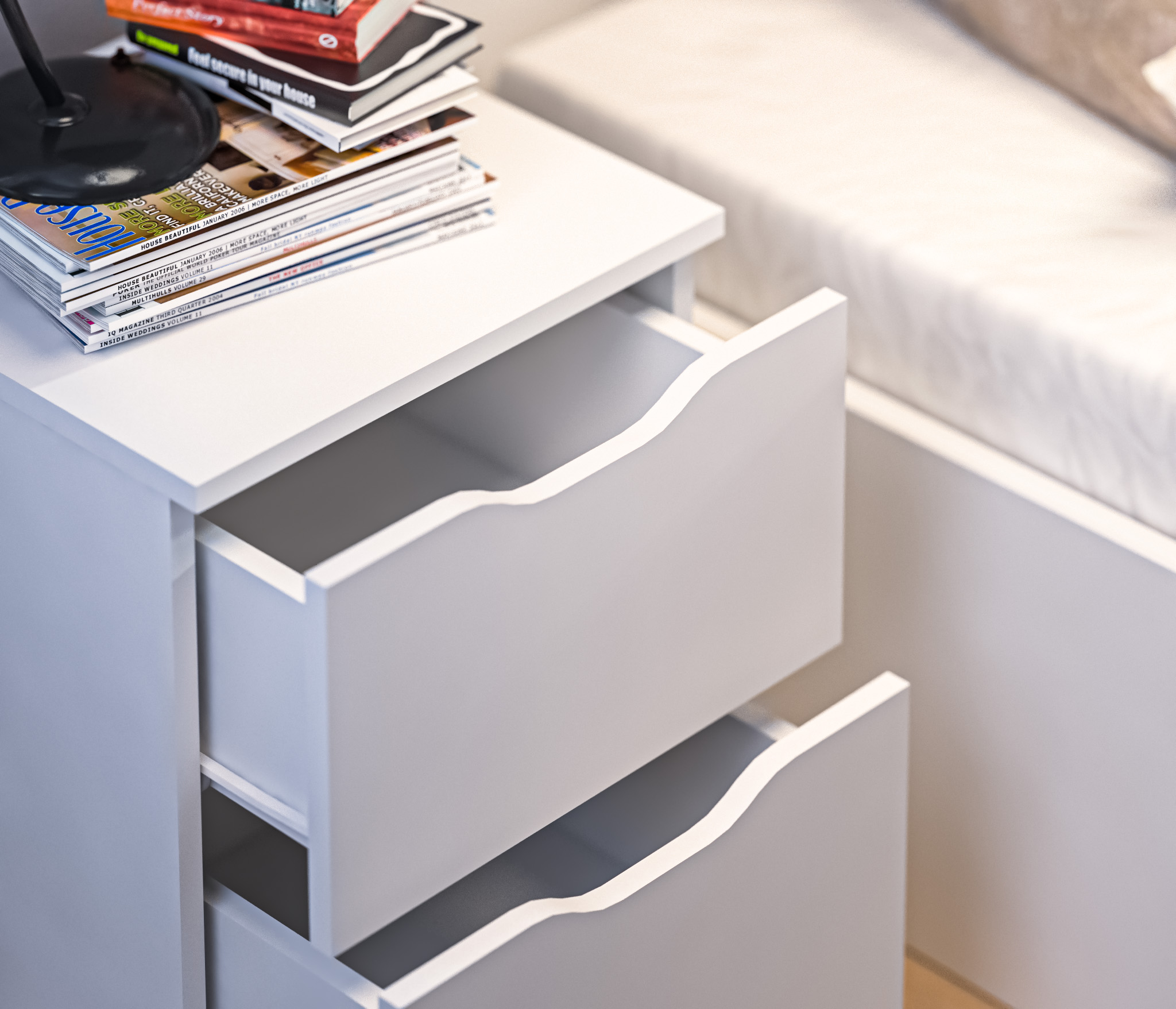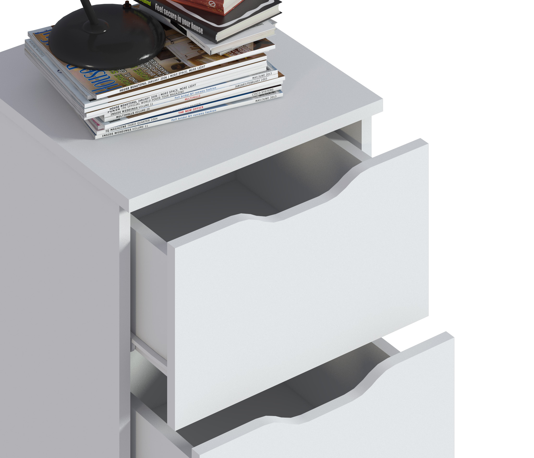 При компактных габаритных размерах – ширина 39 см, высота 53 см и глубина 39 см, тумба довольно вместительная. Под столешницей расположены два выдвижных ящика с прорезными ручками, где можно хранить вещи.