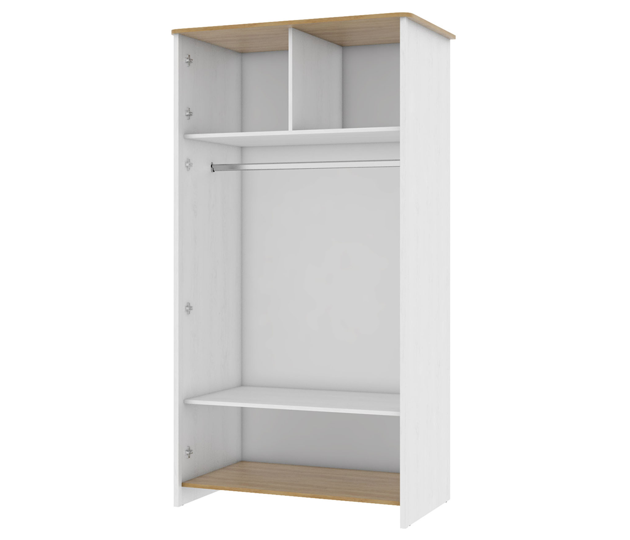Корпус модульной системы изготовлен из 16 мм ламинированой древесностружечной плиты «Дуб Небраска» и 16 мм древесностружечной плиты, укрытой финиш-ппленкой «Сосна Белая». Торцевые поверхности корпуса закромлены кромками ABS и ПВХ. Рамочные фасады изготовлены из МДФ профиля и укутаны финиш-пленкой «Сосна Белая».