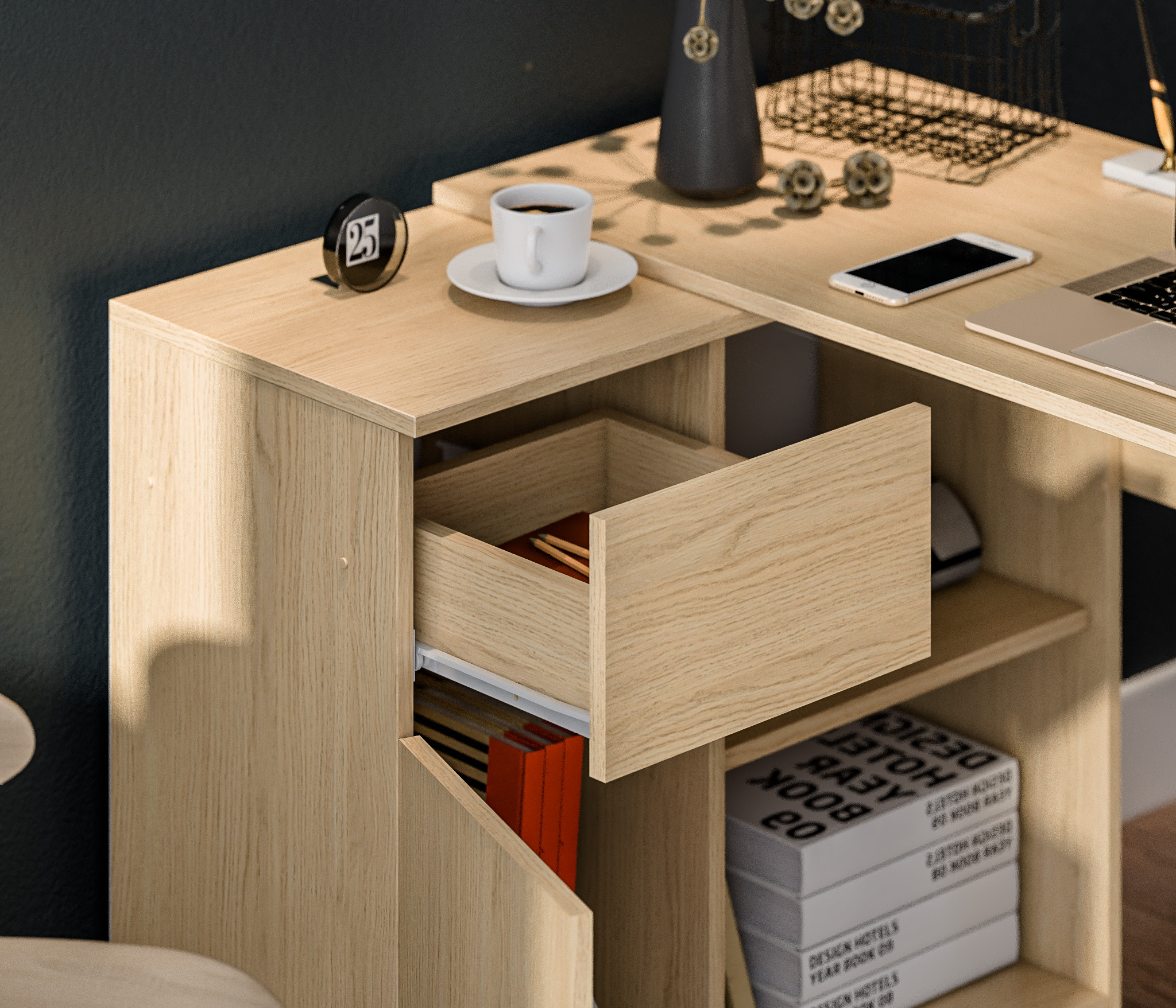 Габаритные размеры – ширина 119 см, высота 75 см и глубина 80 см. Под рабочей поверхностью расположена тумба с открытыми вместительными полками, а также выдвижной ящик и закрытое отделение с отдельной дверцей. Стол произведен из современного экологичного ЛДСП. Возможен как левый, так и правый вариант сборки.