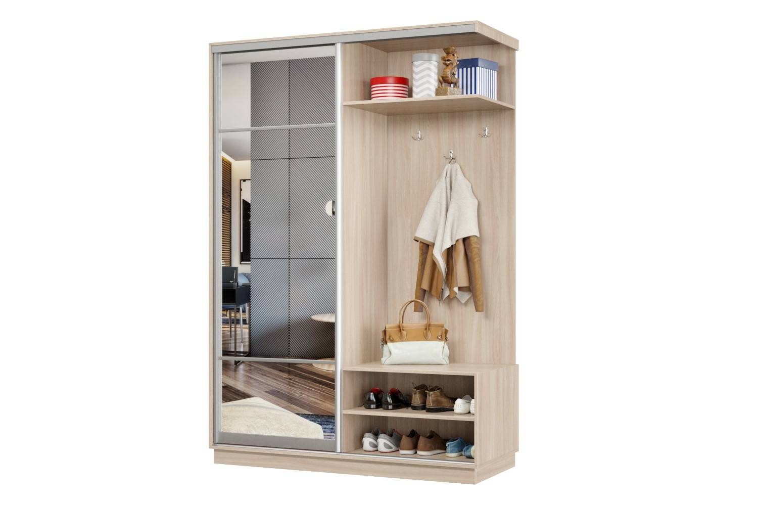 Дверь делит шкаф на 2 равные части: отделение для верхней одежды и отделение с полками и крючками.
