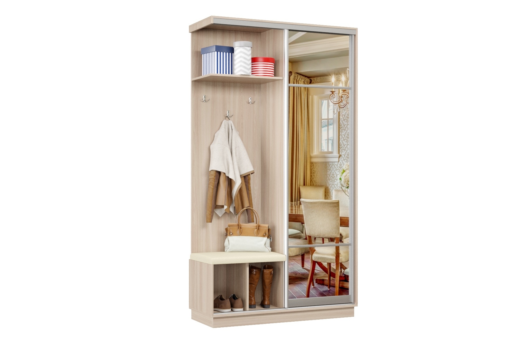 Дверь делит шкаф на 2 равные части: отделение для верхней одежды и отделение с полками и крючками.