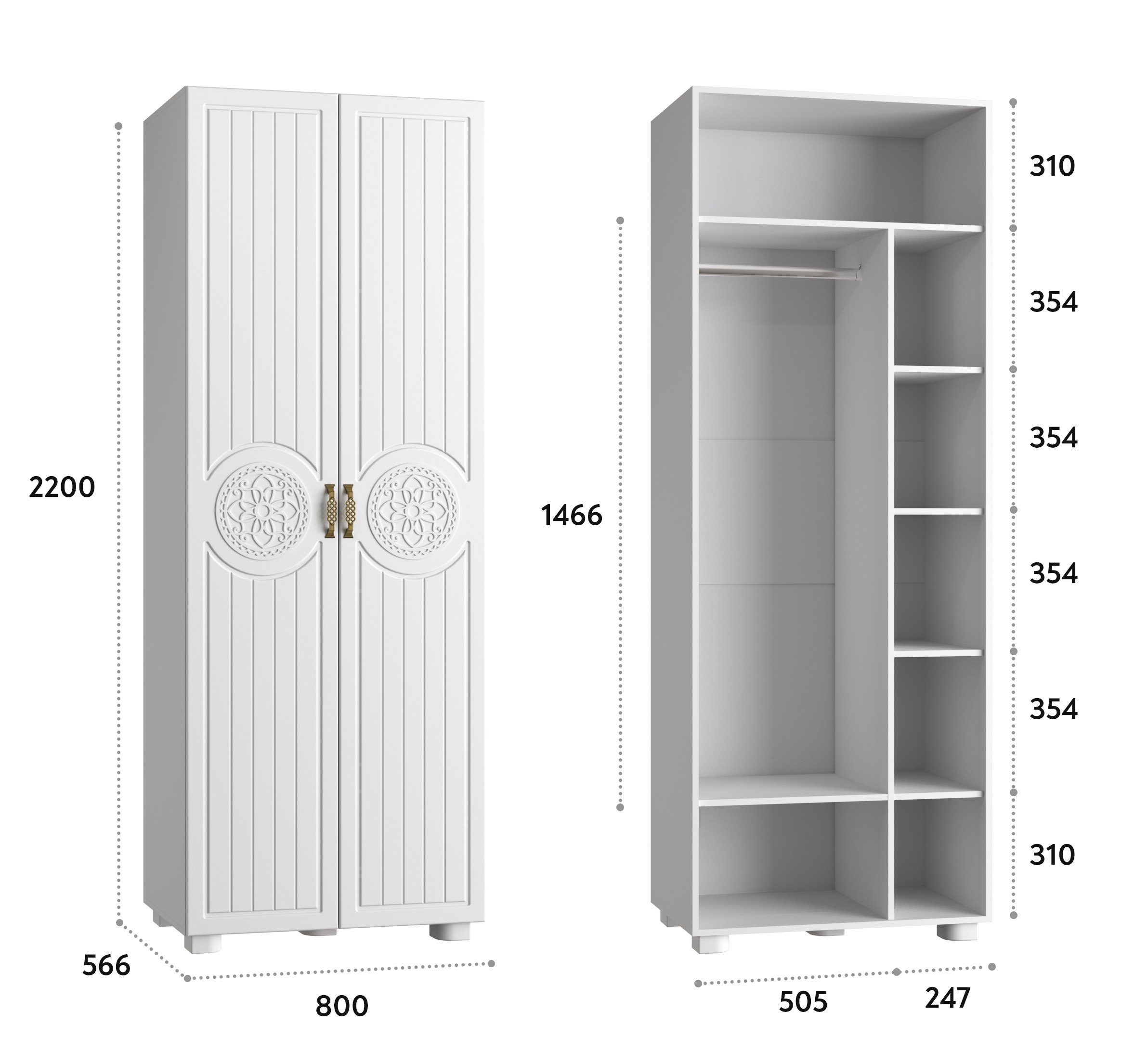 Шкаф двухдверный Монблан МБ-26К станет замечательным дополнением для обустройства комфортной и функциональной комнаты. За распашными дверьми находится штанга для вешалок-плечиков. Полки предназначены для хранения сложенной одежды, белья, различных аксессуаров и коробок с обувью. Двери шкафа могут комплектоваться зеркалами. Высота опоры 50 мм.