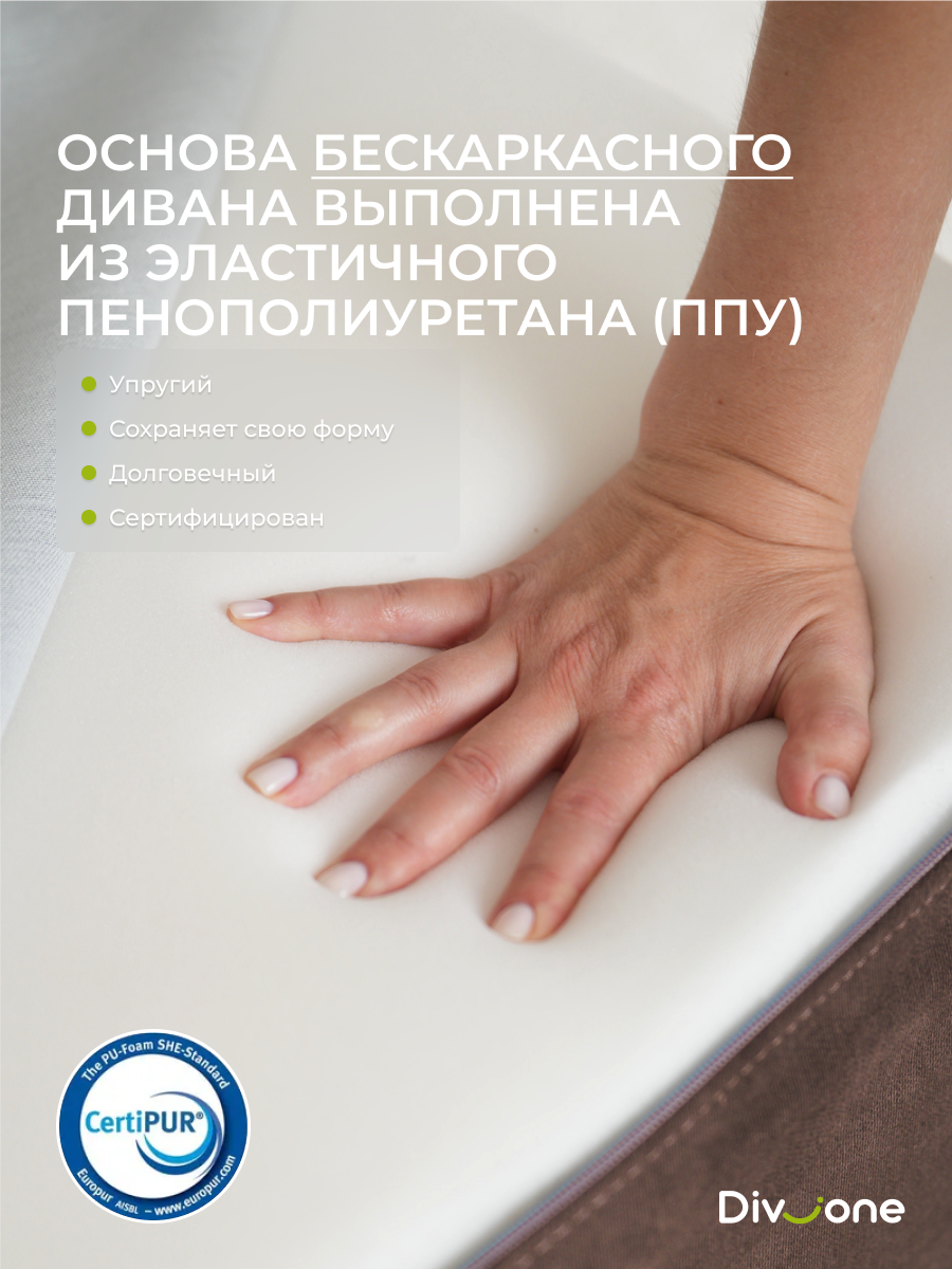 Наши бескаркасные диваны для городской квартиры и загородной дачи изготовлены из материалов высокого качества. Основа выполнена из гипоаллергененного ППУ (Пенополиуретан) толщиной 40 сантиметров, что обеспечивает упругость. Велюр имеет износостойкость — 50 000 циклов по тесту Мартиндейла, что более чем вдвое превышает стандартные требования. Обивка выполнена из качественных материалов, которые легко чистятся и не выцветают со временем. Наполнение верхнего матраса представляет собой смесь упругой поролоновой крошки и воздушного синтепуха. Такой состав препятствует быстрой усадке, эффективно поддерживает первозданную форму изделия и продлевает его срок службы на долгие годы. Таким образом, долговечность и сохранение превосходного внешнего вида гарантированы. Диванчик отлично подходит для сна благодаря своему ортопедическому эффекту.