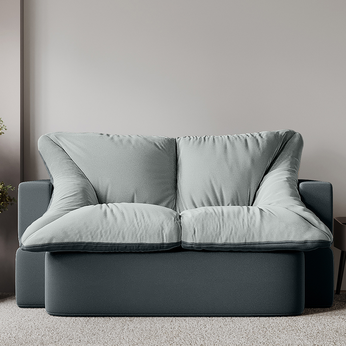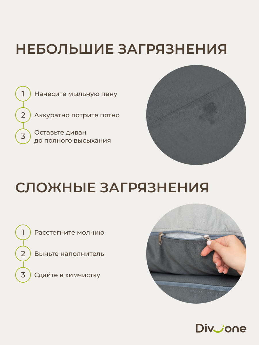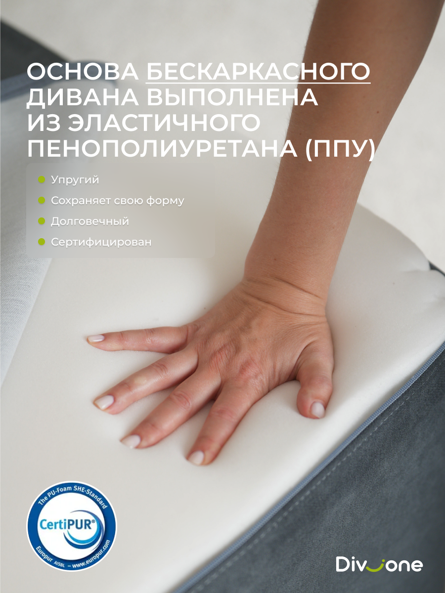 Наши бескаркасные диваны для городской квартиры и загородной дачи изготовлены из материалов высокого качества. Основа выполнена из гипоаллергененного ППУ (Пенополиуретан) толщиной 40 сантиметров, что обеспечивает упругость. Велюр имеет износостойкость — 50 000 циклов по тесту Мартиндейла, что более чем вдвое превышает стандартные требования. Обивка выполнена из качественных материалов, которые легко чистятся и не выцветают со временем. Наполнение верхнего матраса представляет собой смесь упругой поролоновой крошки и воздушного синтепуха. Такой состав препятствует быстрой усадке, эффективно поддерживает первозданную форму изделия и продлевает его срок службы на долгие годы. Таким образом, долговечность и сохранение превосходного внешнего вида гарантированы. Диванчик отлично подходит для сна благодаря своему ортопедическому эффекту.
