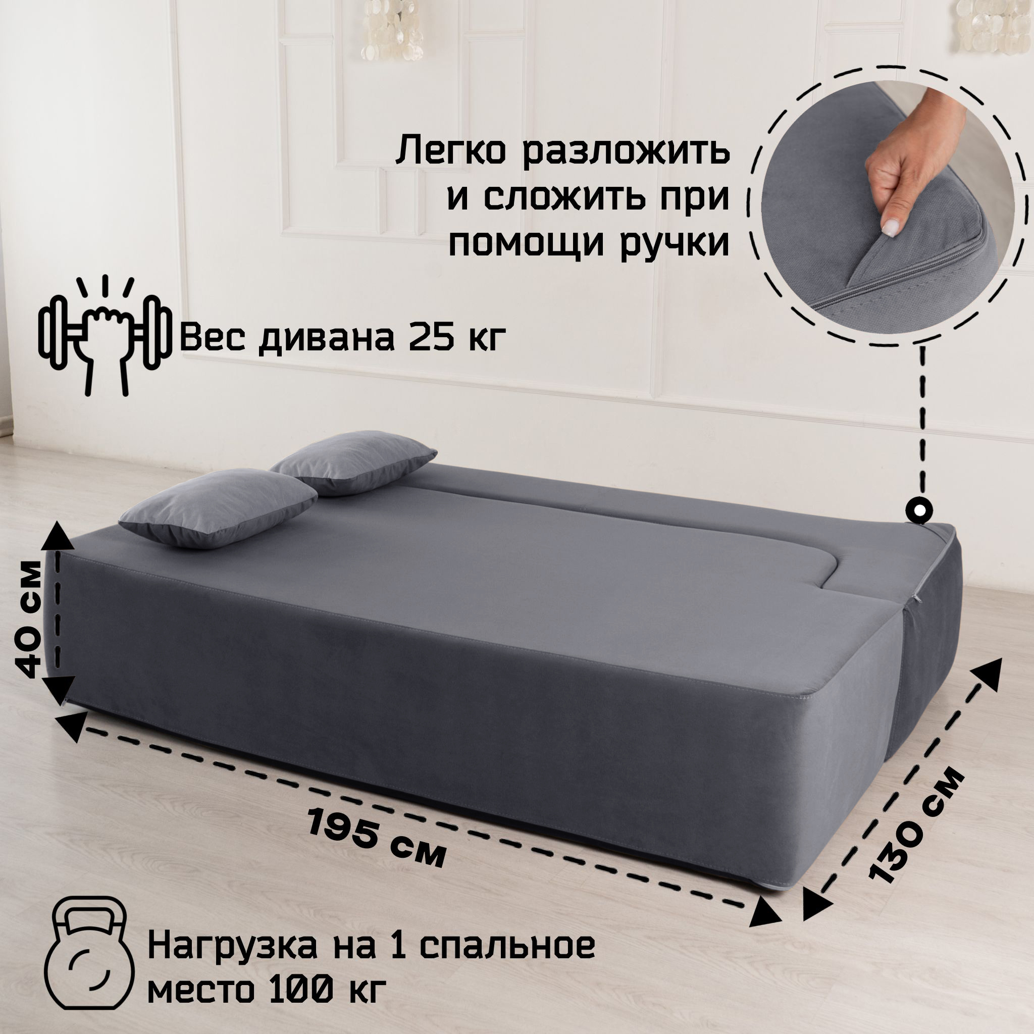 Вес всего 25 кг. Это позволит Вам без усилий поднимать и передвигать бескаркасный трансформер при уборке. Легкость даст возможность перемещать диван-кровать в разные помещения например спальню или на кухню. Благодаря отсутствию твердых элементов в конструкции софа безопасна для ребенка и идеально впишется в детскую комнату.
