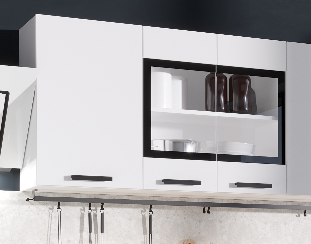 два верхних шкафа: первый шкаф - общая ширина 1000мм (400-глухой , 600-со стеклом) Внимание! Это единый элемент, разъединить шкафы невозможно! Второй шкаф - на 500мм. Высота 626мм. Глубина 270 мм.