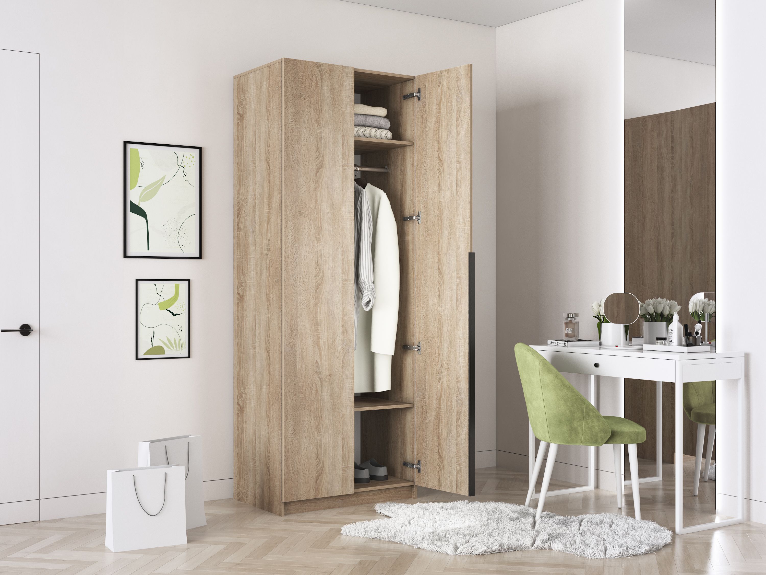 Благодаря надежным полкодержателям - штифтам, полки шкафа могут выдерживать до 15 кг. Шкаф оснащен долговечной, ударостойкой кромкой ПВХ, которая защищает его торцы от сколов и повреждений. Мебельные петли Titus B-Type обеспечивают открывание и закрывание двери под углом 110 градусов, а также предотвращают ее перекос. Наличие отдельного цоколя позволяет поставить шкаф вплотную к стене. Шкаф оснащен удобной минималистичной ручкой, изготовленной из алюминия.