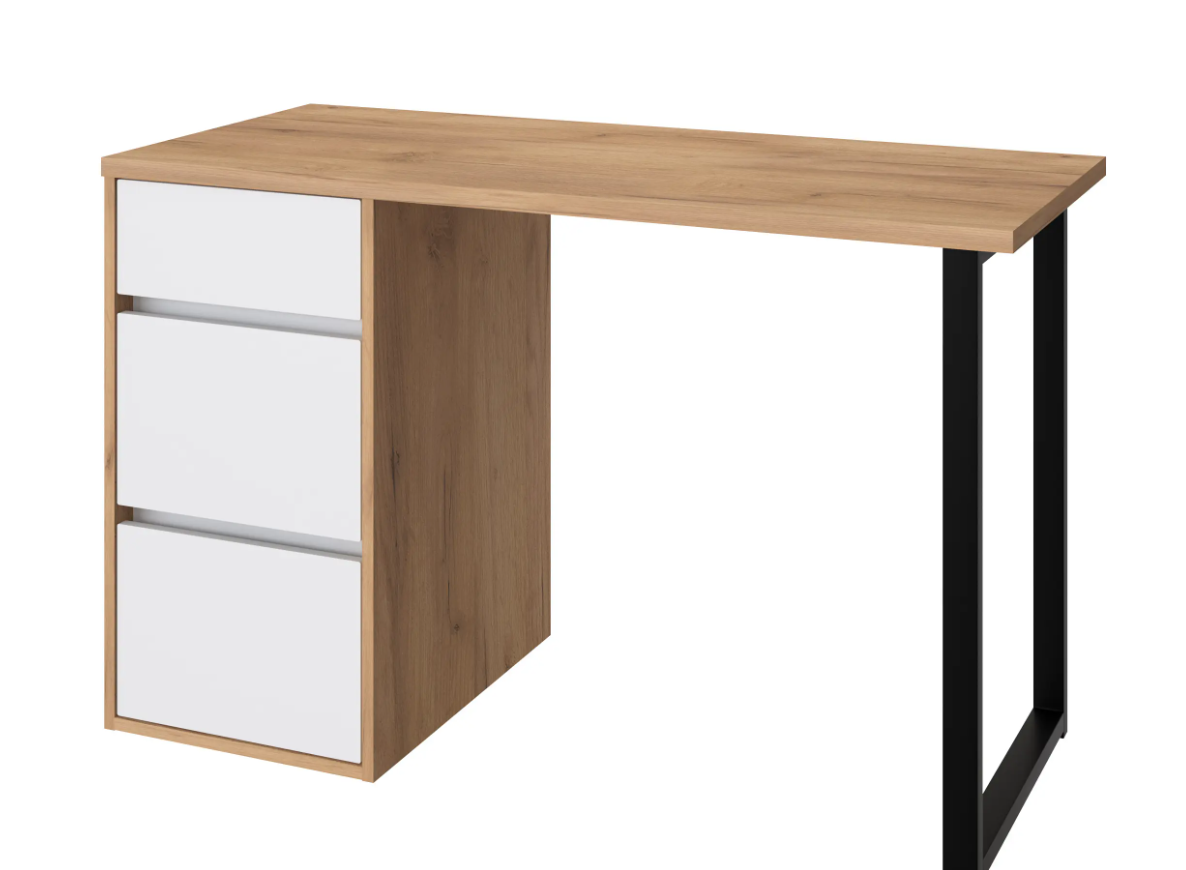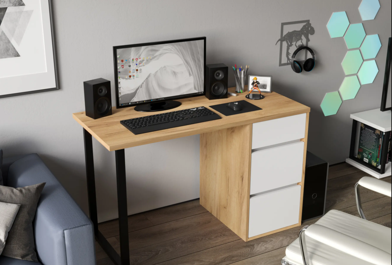 Стол письменный С-401 позволит создать комфортное и стильное рабочее пространство в офисе или домашнем кабинете. Стол С-401 можно использовать в качестве маникюрного стола. Стол имеет прочную стальную опору и тумбу с тремя выдвижными ящиками. Столешница изготовлена из ЛДСП 25 мм. Стол может быть собран в зеркальном варианте «правым» или «левым». Фурнитура: телескопический направляющие полного выдвижения без доводчиков, опора металл.