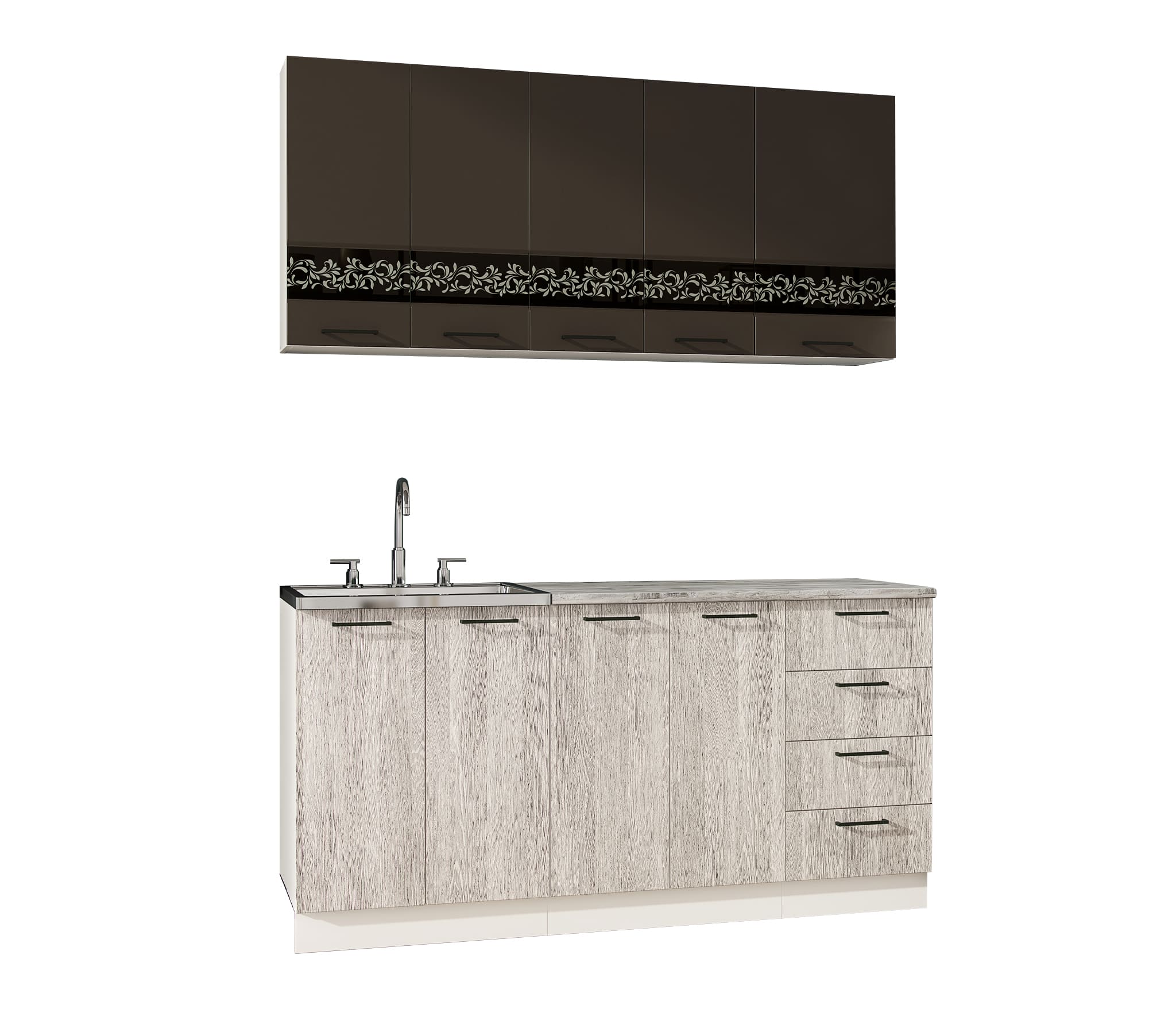 - Нижние корпуса: 600 мм под мойку – 1 шт. 600 мм с распашными фасадами – 1 шт. 400 мм с выдвижными ящиками – 1 шт. Высота 706 мм, глубина 450 мм. Материал ЛДСП.